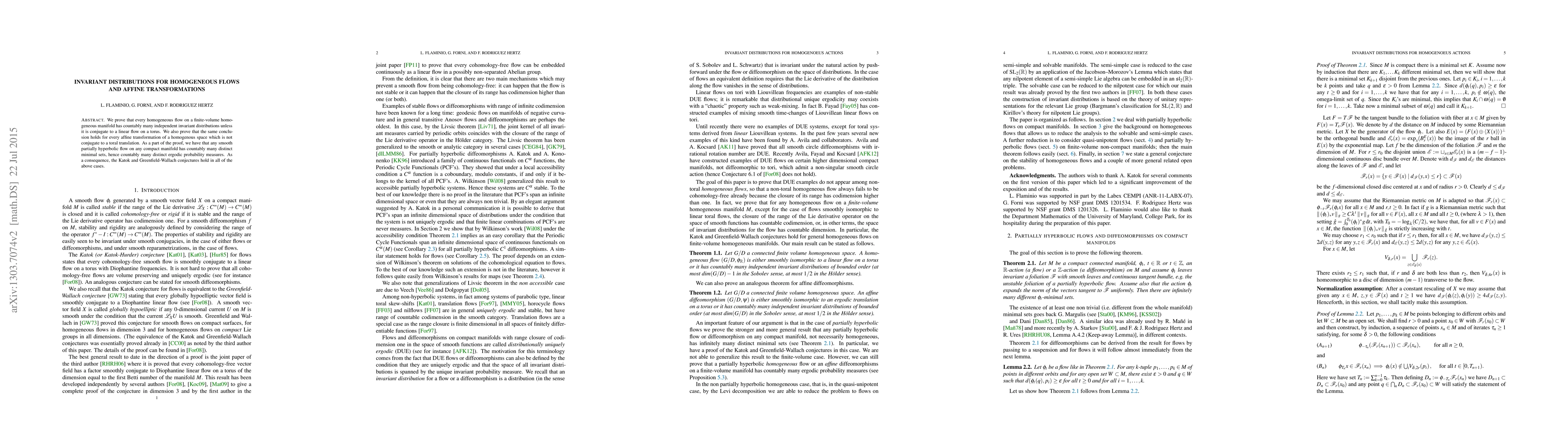 This paper proves that homogeneous flows on finite-volume manifolds possess countably many independent invariant distributions unless they are conjugate to linear flows on tori. It also extends these findings to affine transformations of homogeneous spaces, confirming the Katok and Greenfield-Wallach conjectures in these contexts.