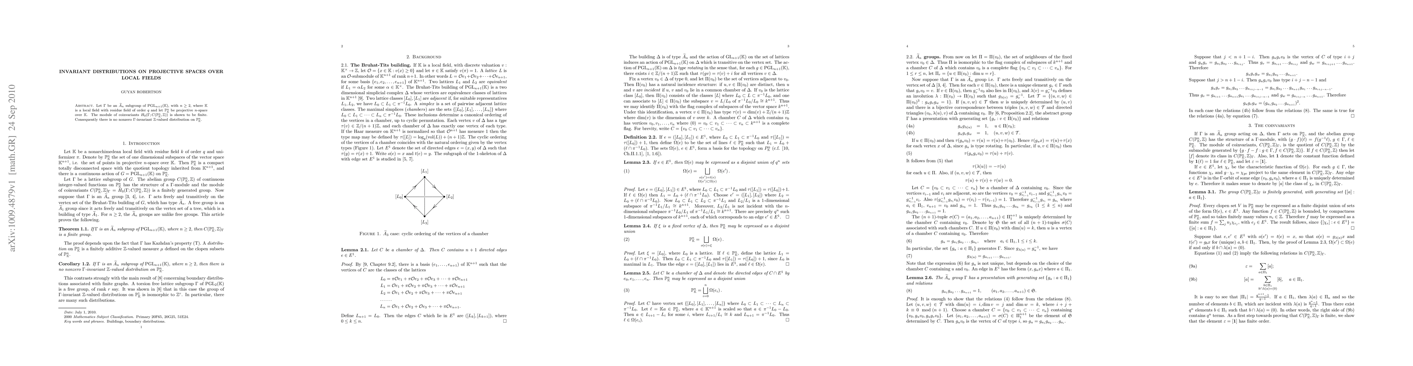 Let $\Gamma$ be an $\widetilde A_n$ subgroup of $PGL_{n+1}(K)$, with $n\ge 2$, where $K$ is a local field with residue field of order $q$ and let $\bb P^n_{K}$ be projective $n$-space over $K$. The module of coinvariants $H_0(\Gamma; C(P^n_{K},Z))$ is shown to be finite. Consequently there is no nonzero $\Gamma$-invariant $Z$-valued distribution on $P^n_{K}$.