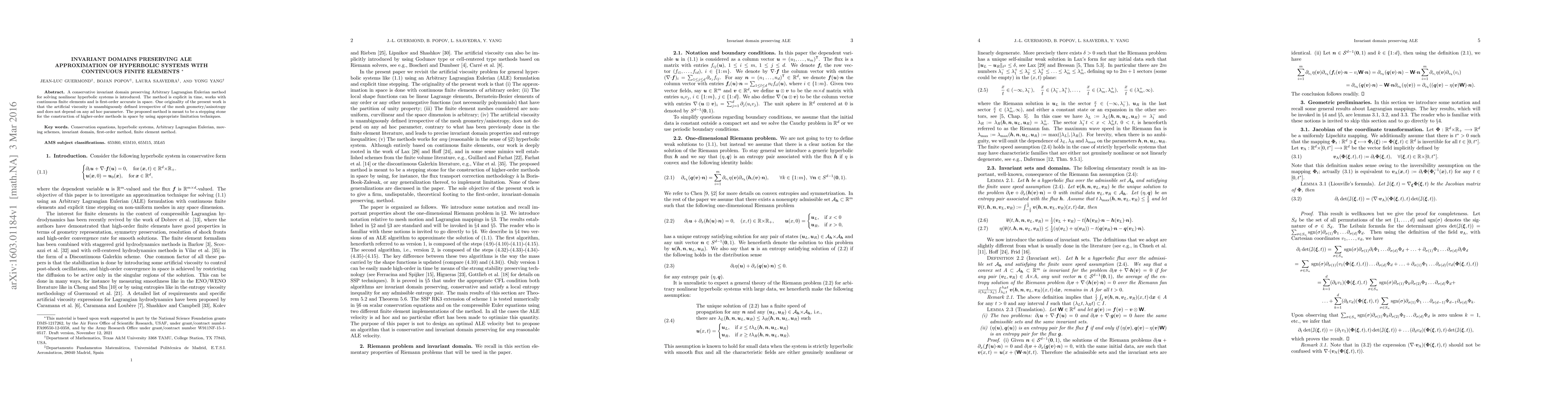 A conservative invariant domain preserving Arbitrary Lagrangian Eulerian method for solving nonlinear hyperbolic systems is introduced. The method is explicit in time, works with continuous finite elements and is first-order accurate in space. One originality of the present work is that the artificial viscosity is unambiguously defined irrespective of the mesh geometry/anisotropy and does not depend on any ad hoc parameter. The proposed method is meant to be a stepping stone for the construction of higher-order methods in space by using appropriate limitation techniques.