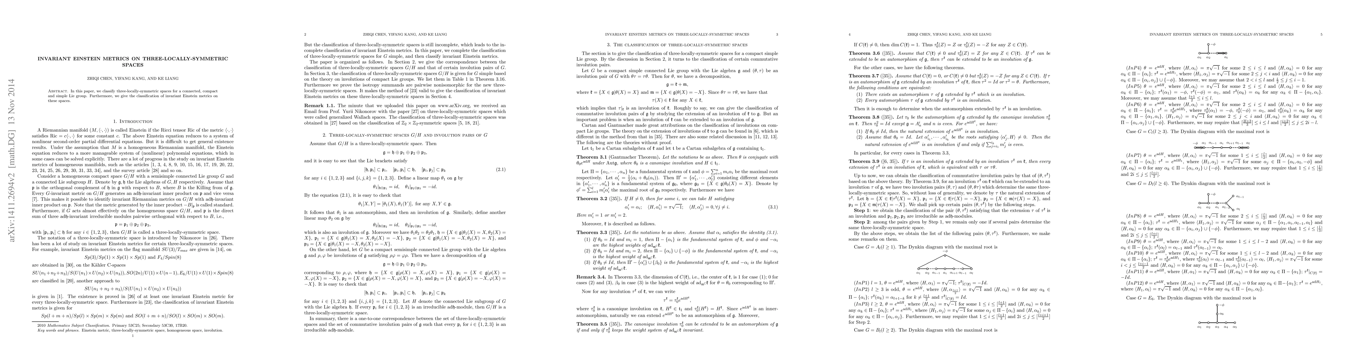 This paper classifies three-locally-symmetric spaces associated with connected, compact, and simple Lie groups, and provides a comprehensive classification of invariant Einstein metrics on these spaces.