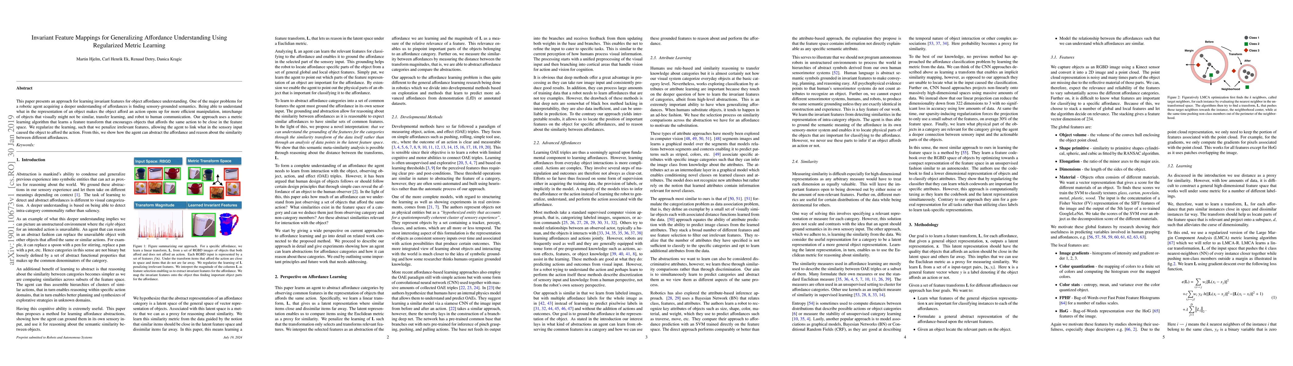This paper presents an approach for learning invariant features for object affordance understanding. One of the major problems for a robotic agent acquiring a deeper understanding of affordances is finding sensory-grounded semantics. Being able to understand what in the representation of an object makes the object afford an action opens up for more efficient manipulation, interchange of objects that visually might not be similar, transfer learning, and robot to human communication. Our approach uses a metric learning algorithm that learns a feature transform that encourages objects that affords the same action to be close in the feature space. We regularize the learning, such that we penalize irrelevant features, allowing the agent to link what in the sensory input caused the object to afford the action. From this, we show how the agent can abstract the affordance and reason about the similarity between different affordances.