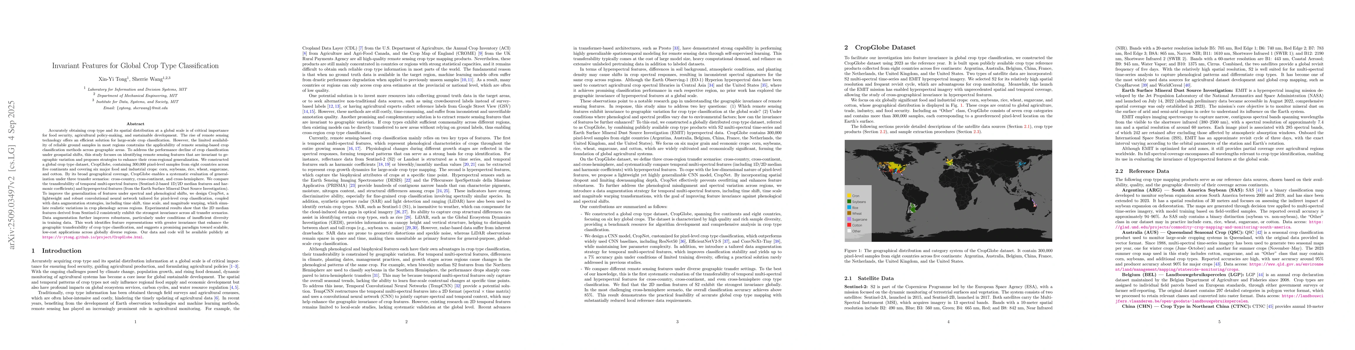 Accurately obtaining crop type and its spatial distribution at a global scale is critical for food security, agricultural policy-making, and sustainable development. Remote sensing offers an efficient solution for large-scale crop classification, but the limited availability of reliable ground samples in many regions constrains applicability across geographic areas. To address performance declines under geospatial shifts, this study identifies remote sensing features that are invariant to geographic variation and proposes strategies to enhance cross-regional generalization. We construct CropGlobe, a global crop type dataset with 300,000 pixel-level samples from eight countries across five continents, covering six major food and industrial crops (corn, soybeans, rice, wheat, sugarcane, cotton). With broad geographic coverage, CropGlobe enables a systematic evaluation under cross-country, cross-continent, and cross-hemisphere transfer. We compare the transferability of temporal multi-spectral features (Sentinel-2-based 1D/2D median features and harmonic coefficients) and hyperspectral features (from EMIT). To improve generalization under spectral and phenological shifts, we design CropNet, a lightweight and robust CNN tailored for pixel-level crop classification, coupled with temporal data augmentation (time shift, time scale, and magnitude warping) that simulates realistic cross-regional phenology. Experiments show that 2D median temporal features from Sentinel-2 consistently exhibit the strongest invariance across all transfer scenarios, and augmentation further improves robustness, particularly when training data diversity is limited. Overall, the work identifies more invariant feature representations that enhance geographic transferability and suggests a promising path toward scalable, low-cost crop type applications across globally diverse regions.