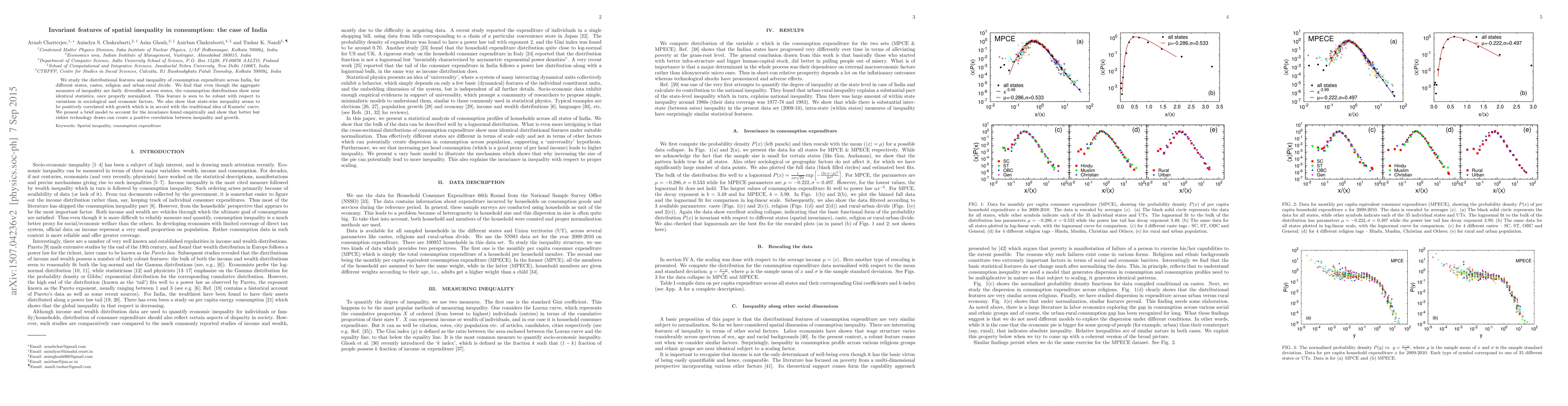 We study the distributional features and inequality of consumption expenditure across India, for different states, castes, religion and urban-rural divide. We find that even though the aggregate measures of inequality are fairly diversified across states, the consumption distributions show near identical statistics, once properly normalized. This feature is seen to be robust with respect to variations in sociological and economic factors. We also show that state-wise inequality seems to be positively correlated with growth which is in accord with the traditional idea of Kuznets' curve. We present a brief model to account for the invariance found empirically and show that better but riskier technology draws can create a positive correlation between inequality and growth.
