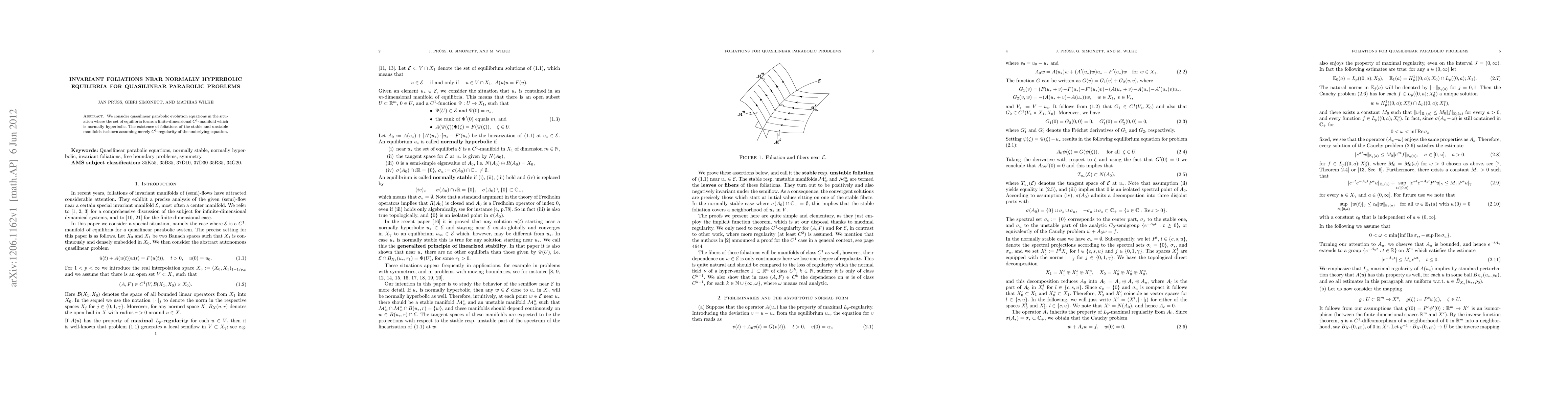 Summary: This paper demonstrates the existence of invariant foliations of stable and unstable manifolds for quasilinear parabolic equations with normally hyperbolic equilibria, relying only on C^1-regularity of the equation. The study focuses on the structure near these equilibria.