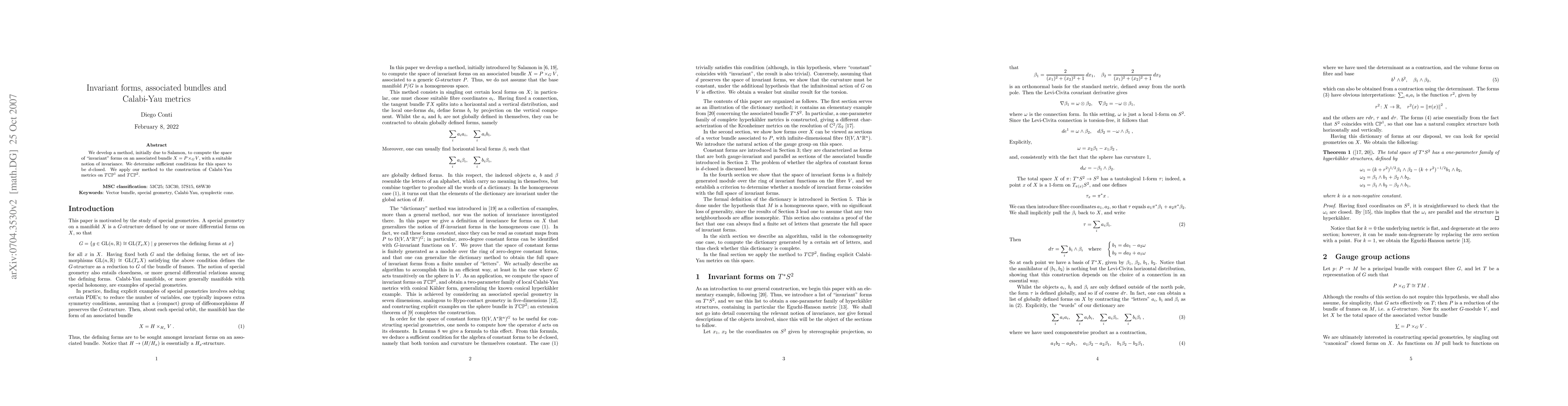 This paper develops a method to calculate invariant forms on associated bundles and determines conditions for their d-closedness. It applies this method to construct Calabi-Yau metrics on complex projective spaces TCP^1 and TCP^2.
