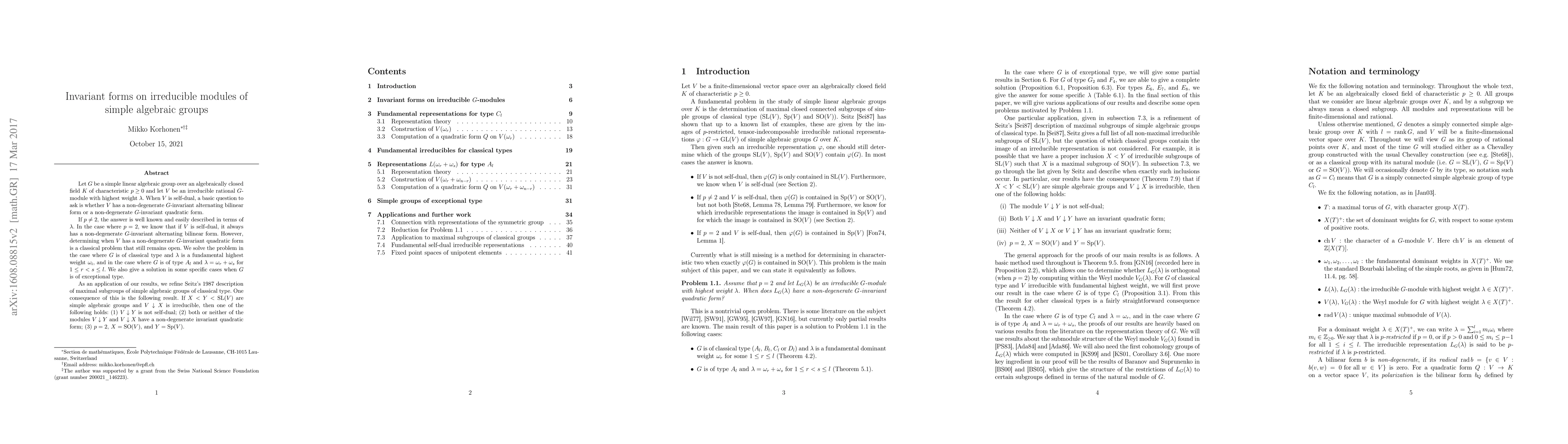 Researchers investigate whether irreducible modules of simple algebraic groups have non-degenerate invariant quadratic forms, resolving this problem for certain types of groups and providing a refinement of Seitz's 1987 description of maximal subgroups.