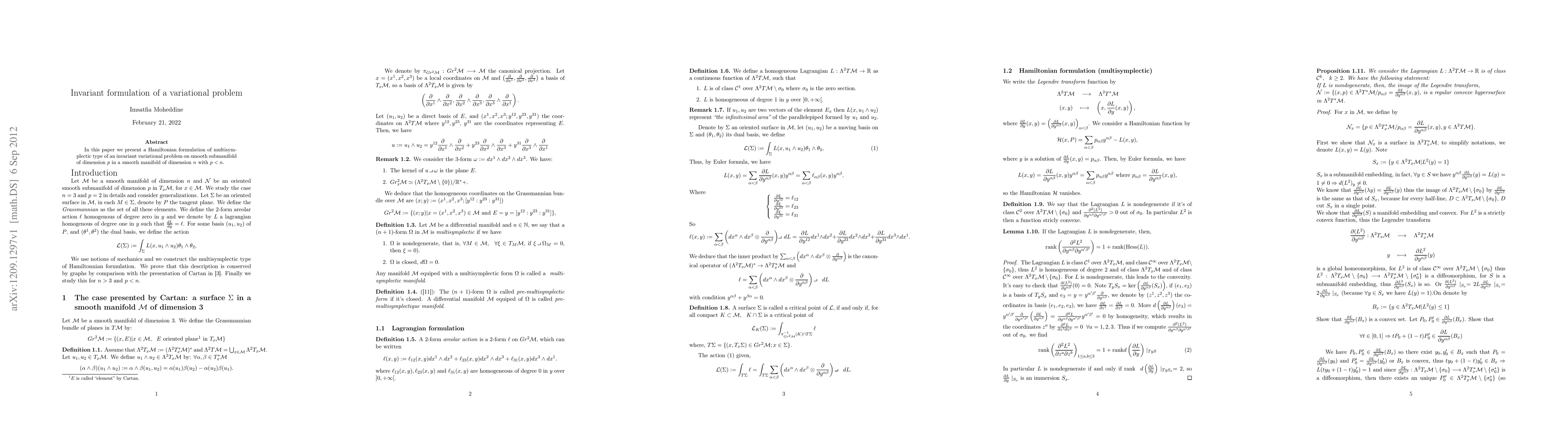 an invariant variational problem on smooth submanifold of dimension $p$ in a