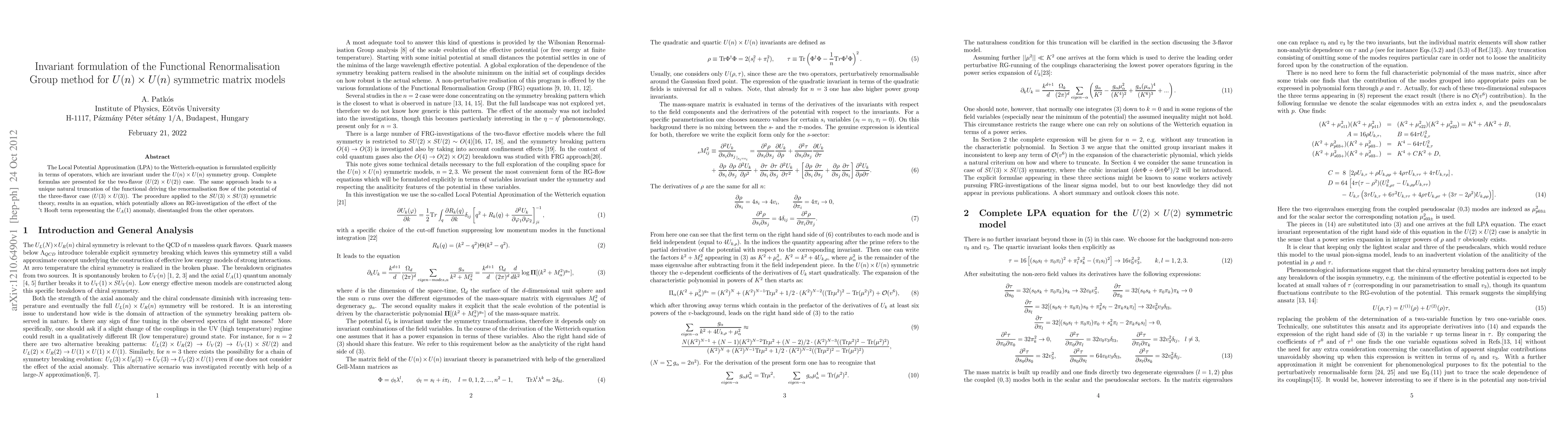The Local Potential Approximation (LPA) to the Wetterich-equation is formulated explicitly in terms of operators, which are invariant under the $U(n)\times U(n)$ symmetry group. Complete formulas are presented for the two-flavor ($U(2)\times U(2)$) case. The same approach leads to a unique natural truncation of the functional driving the renormalisation flow of the potential of the three-flavor case ($U(3)\times U(3)$). The procedure applied to the $SU(3)\times SU(3)$ symmetric theory, results in an equation, which potentially allows an RG-investigation of the effect of the 't Hooft term representing the $U_A(1)$ anomaly, disentangled from the other operators.