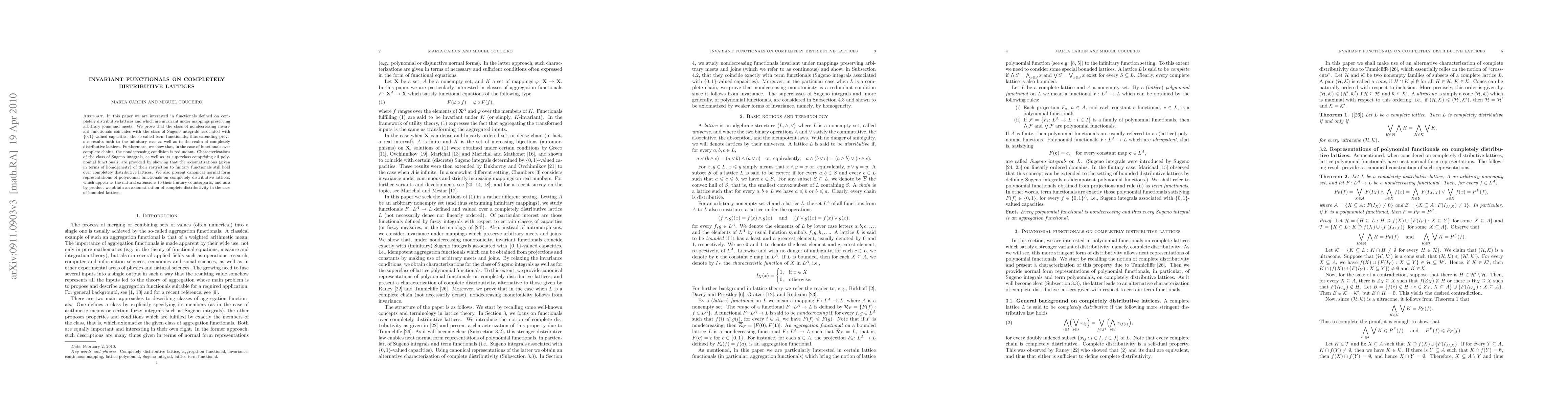 In this paper we are interested in functionals defined on completely distributive lattices and which are invariant under mappings preserving {arbitrary} joins and meets. We prove that the class of nondecreasing invariant functionals coincides with the class of Sugeno integrals associated with $\{0,1\}$-valued capacities, the so-called term functionals, thus extending previous results both to the infinitary case as well as to the realm of completely distributive lattices. Furthermore, we show that, in the case of functionals over complete chains, the nondecreasing condition is redundant. Characterizations of the class of Sugeno integrals, as well as its superclass comprising all polynomial functionals, are provided by showing that the axiomatizations (given in terms of homogeneity) of their restriction to finitary functionals still hold over completely distributive lattices. We also present canonical normal form representations of polynomial functionals on completely distributive lattices, which appear as the natural extensions to their finitary counterparts, and as a by-product we obtain an axiomatization of complete distributivity in the case of bounded lattices.