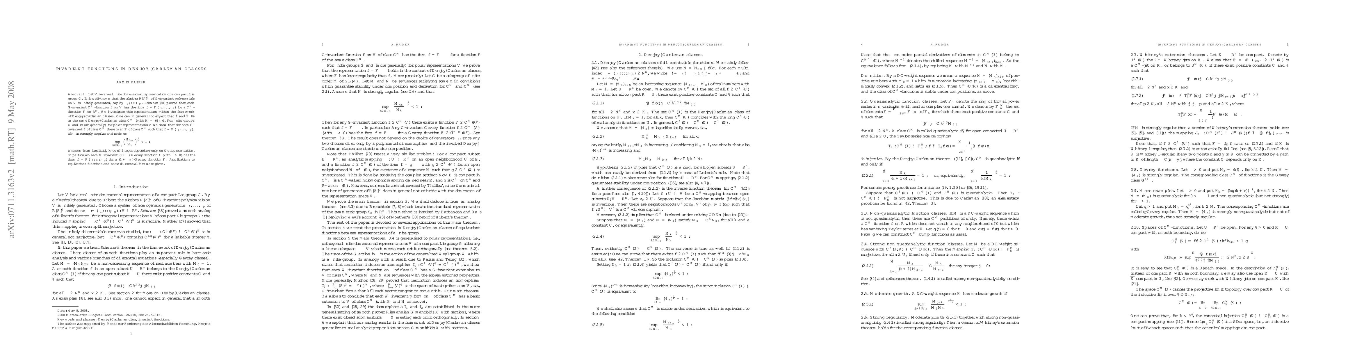 This paper investigates the representation of $G$-invariant $C^\infty$-functions in Denjoy-Carleman classes, proving that for finite groups and polar representations, a $G$-invariant function of class $C_M$ can be expressed as a function of finitely many $G$-invariant polynomials, with the representing function in a suitably related Denjoy-Carleman class. Applications to equivariant functions and differential forms are also discussed.