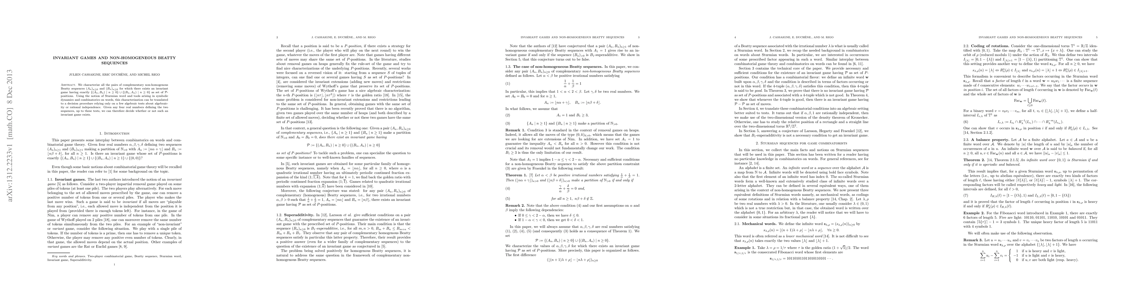 This paper characterizes pairs of complementary non-homogeneous Beatty sequences that define an invariant game with specific positions. It translates this characterization into a decision procedure based on algebraic tests for rational independence, enabling the determination of whether such an invariant game exists given the sequences' defining parameters.
