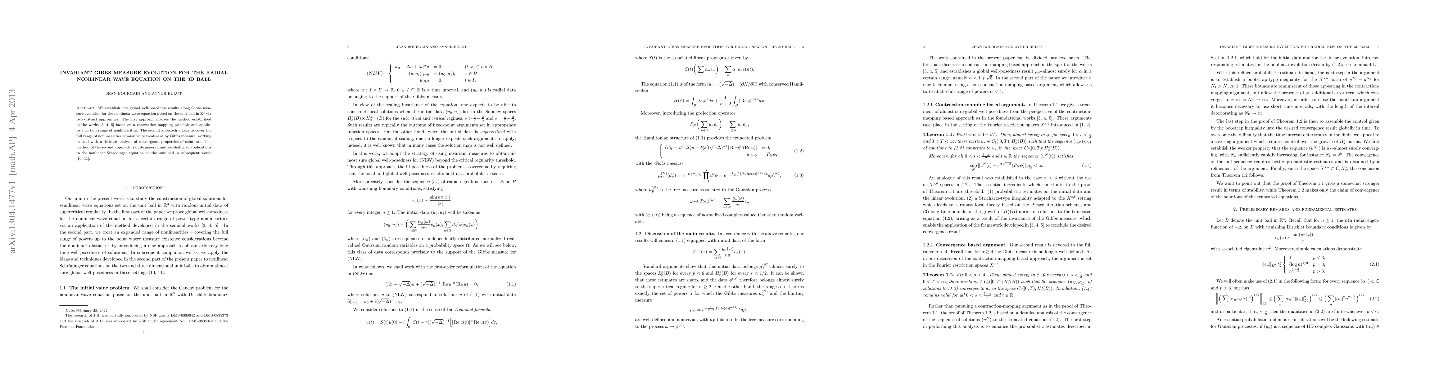 We establish new global well-posedness results along Gibbs measure evolution for the nonlinear wave equation posed on the unit ball in $\mathbb{R}^3$ via two distinct approaches. The first approach invokes the method established in the works \cite{B1,B2,B3} based on a contraction-mapping principle and applies to a certain range of nonlinearities. The second approach allows to cover the full range of nonlinearities admissible to treatment by Gibbs measure, working instead with a delicate analysis of convergence properties of solutions. The method of the second approach is quite general, and we shall give applications to the nonlinear Schr\"odinger equation on the unit ball in subsequent works \cite{BB1,BB2}.