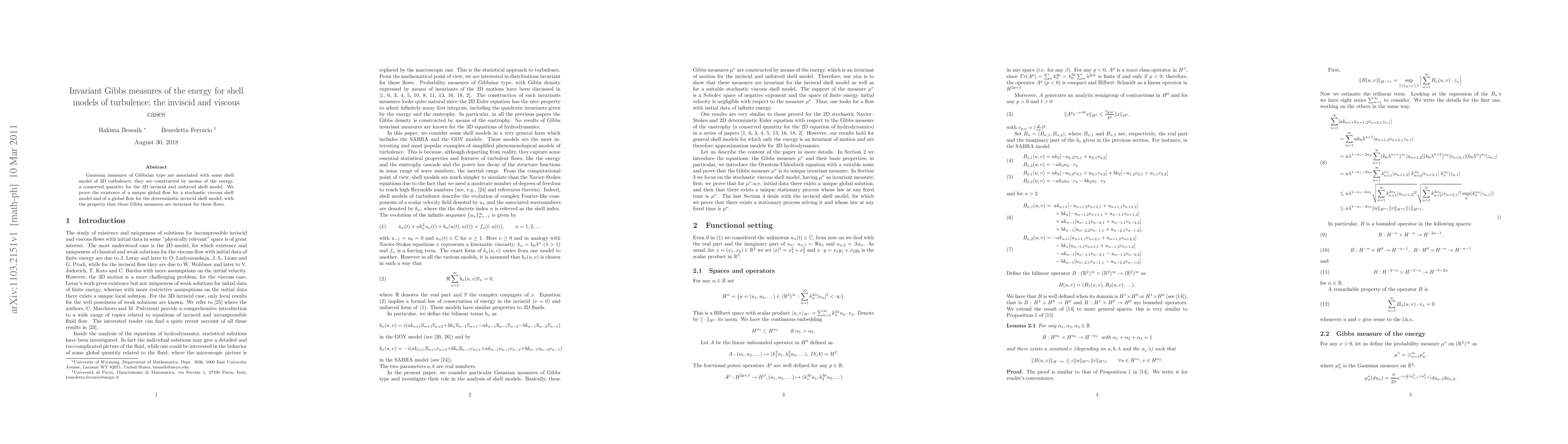 This paper establishes the existence of invariant Gaussian Gibbs measures for shell models of 3D turbulence, proving a unique global flow for both stochastic viscous and deterministic inviscid models, with these measures remaining invariant under the respective flows.