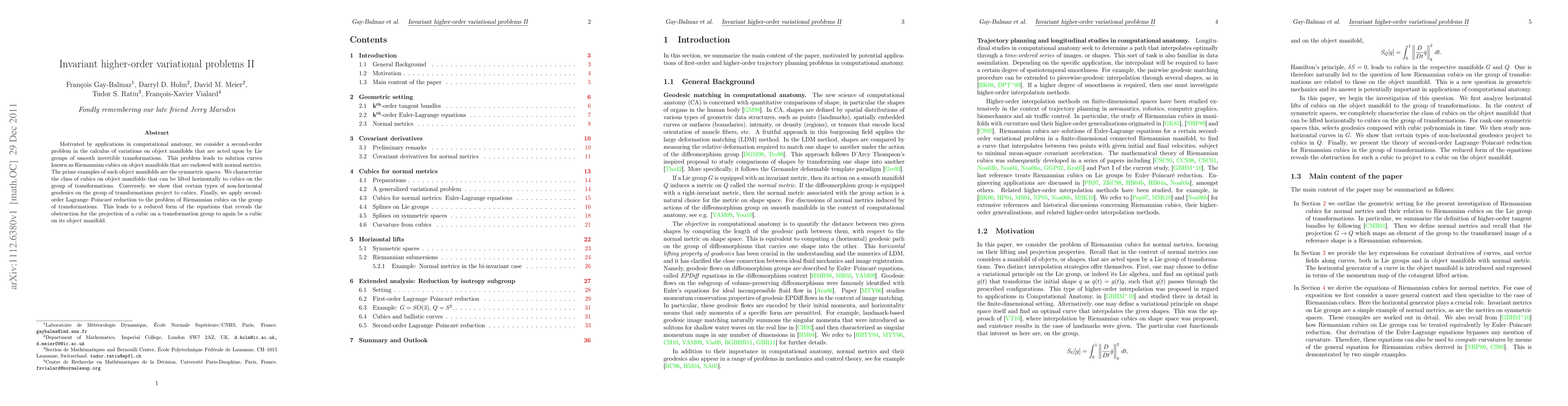 Motivated by applications in computational anatomy, we consider a second-order problem in the calculus of variations on object manifolds that are acted upon by Lie groups of smooth invertible transformations. This problem leads to solution curves known as Riemannian cubics on object manifolds that are endowed with normal metrics. The prime examples of such object manifolds are the symmetric spaces. We characterize the class of cubics on object manifolds that can be lifted horizontally to cubics on the group of transformations. Conversely, we show that certain types of non-horizontal geodesics on the group of transformations project to cubics. Finally, we apply second-order Lagrange--Poincar\'e reduction to the problem of Riemannian cubics on the group of transformations. This leads to a reduced form of the equations that reveals the obstruction for the projection of a cubic on a transformation group to again be a cubic on its object manifold.