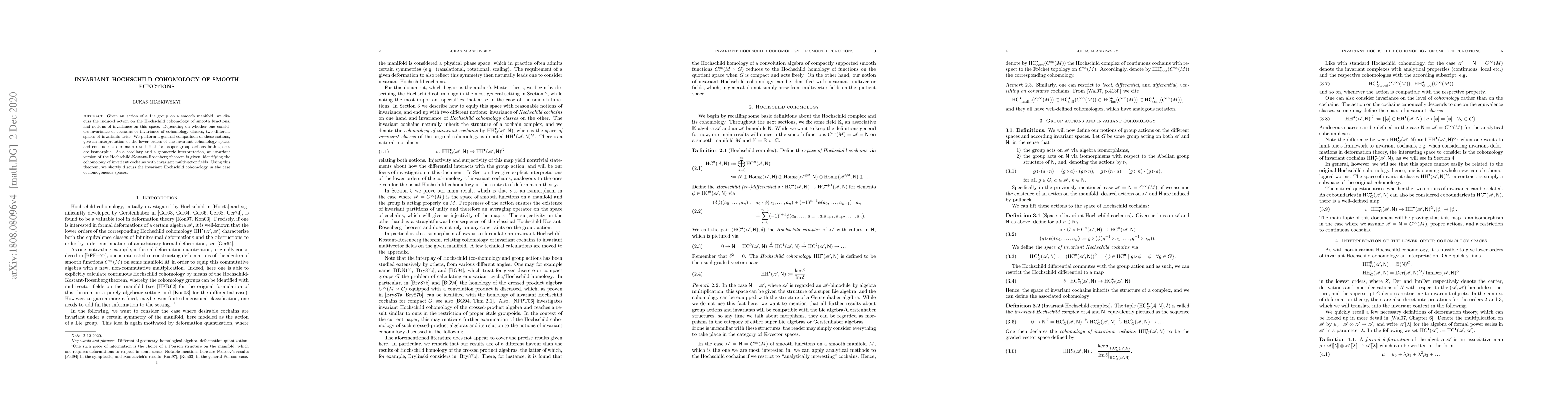 This paper investigates the invariant Hochschild cohomology of smooth functions under the action of a Lie group on a smooth manifold, comparing the invariance of cochains versus cohomology classes. It concludes that for proper group actions, both notions of invariants yield isomorphic spaces, and provides an invariant version of the Hochschild-Kostant-Rosenberg theorem for homogeneous spaces.