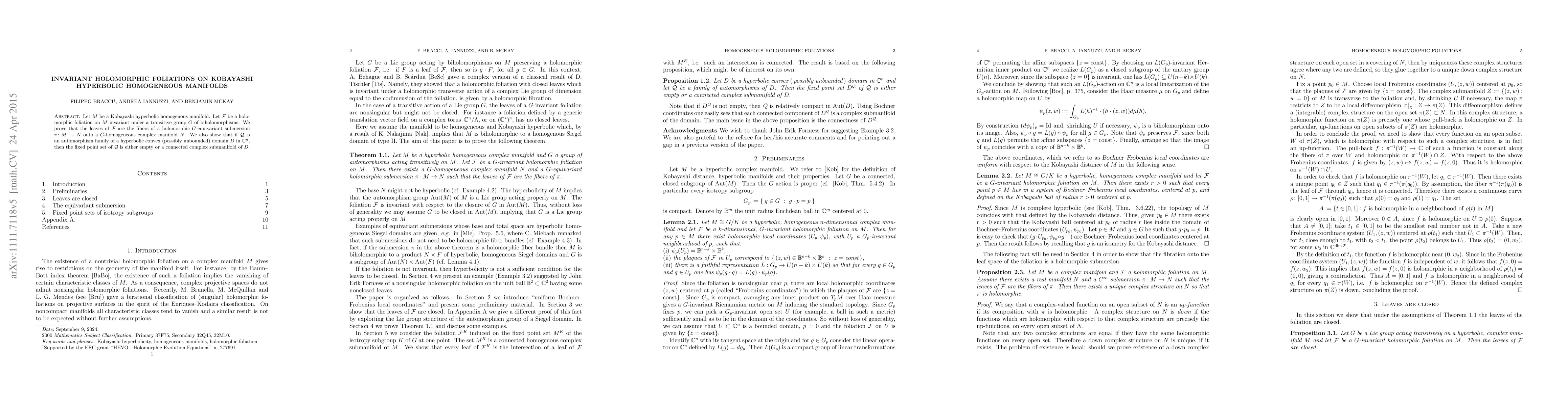 Let $M$ be a Kobayashi hyperbolic homogenous manifold. Let $\mathcal F$ be a holomorphic foliation on $M$ invariant under a transitive group $G$ of biholomorphisms. We prove that the leaves of $\mathcal F$ are the fibers of a holomorphic $G$-equivariant submersion $\pi \colon M \to N$ onto a $G$-homogeneous complex manifold $N$. We also show that if $\mathcal Q$ is an automorphism family of a hyperbolic convex (possibly unbounded) domain $D$ in $\mathbb C^n$, then the fixed point set of $\mathcal Q$ is either empty or a connected complex submanifold of $D$.