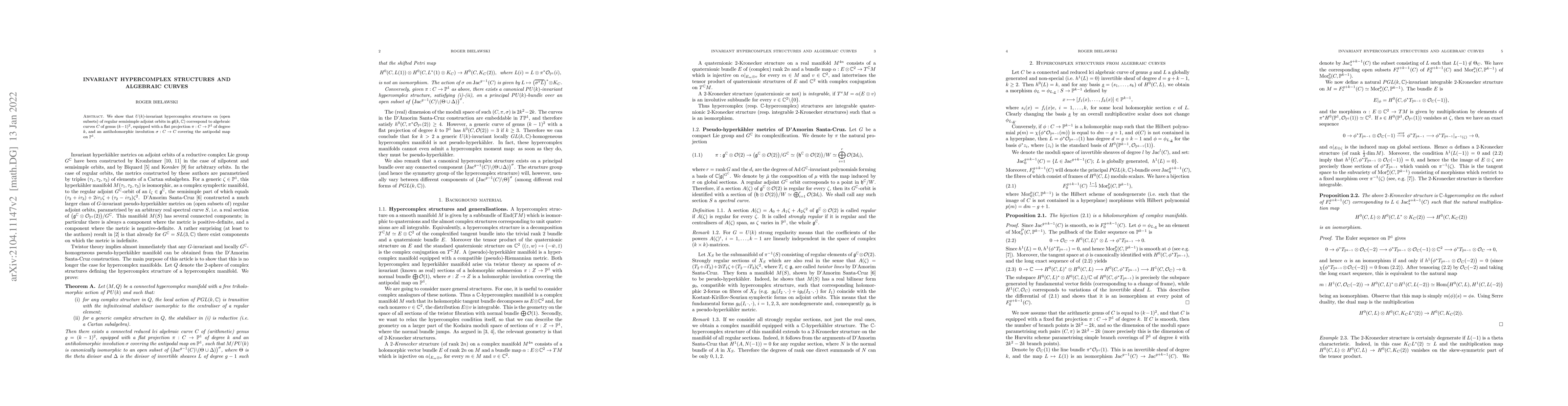 Summary: The paper establishes a correspondence between $U(k)$-invariant hypercomplex structures on regular semisimple adjoint orbits and algebraic curves of genus $(k-1)^2$ with a specific flat projection and antiholomorphic involution. This connection highlights the intricate relationship between algebraic geometry and complex structures.
