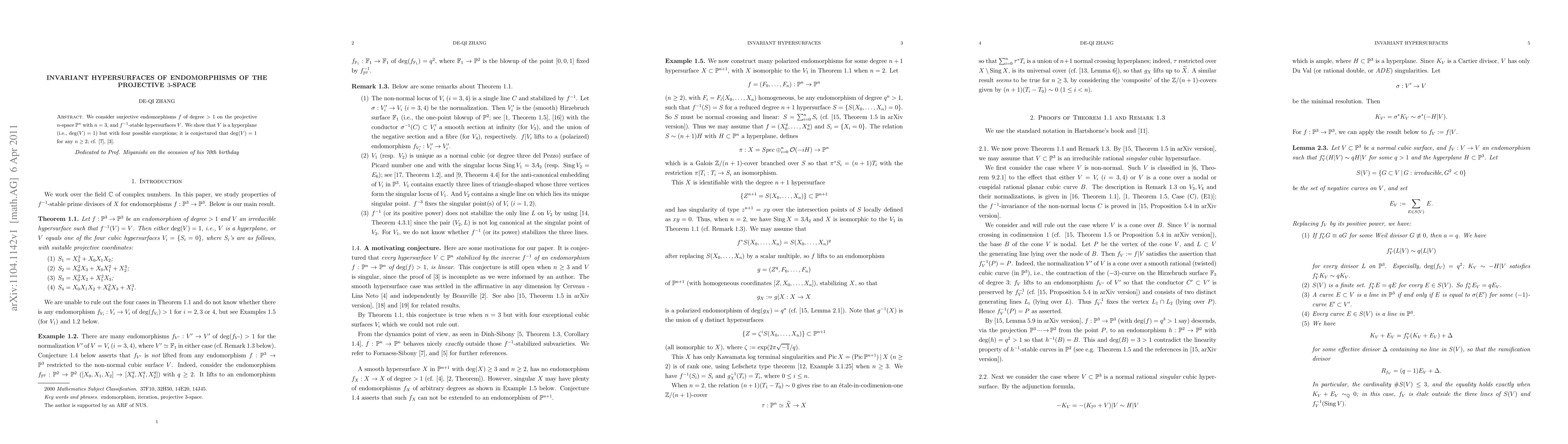 This paper investigates surjective endomorphisms of projective 3-space and demonstrates that f^{-1}-stable hypersurfaces are typically hyperplanes, except for four specific cases. The study supports a conjecture that degree 1 hypersurfaces are stable for n > 1.