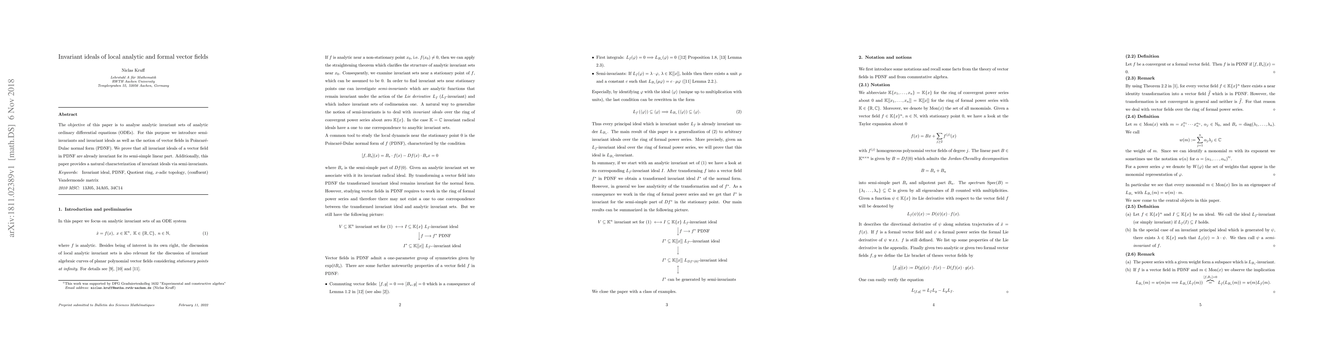 The objective of this paper is to analyse analytic invariant sets of analytic ordinary differential equations (ODEs). For this purpose we introduce semi-invariants and invariant ideals as well as the notion of vector fields in Poincare- Dulac normal form (PDNF). We prove that all invariant ideals of a vector field in PDNF are already invariant for its semi-simple linear part. Additionally, this paper provides a natural characterization of invariant ideals via semi-invariants.