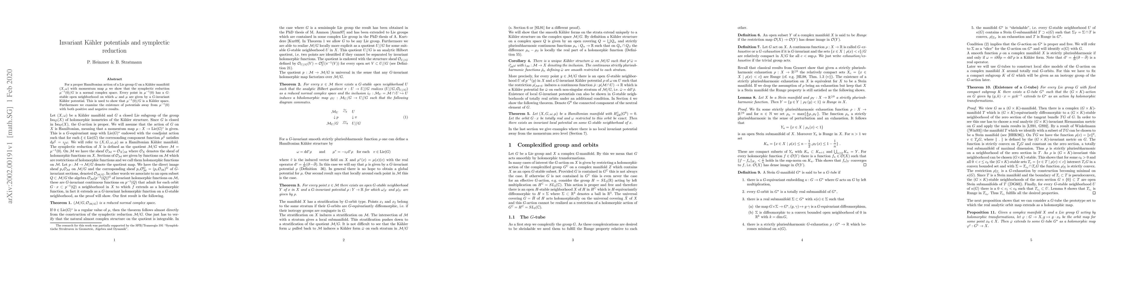 For a proper Hamiltonian action of a Lie group $G$ on a K\"ahler manifold $(X,\omega)$ with momentum map $\mu$ we show that the symplectic reduction $\mu^{-1}(0)/G$ is a normal complex space. Every point in $\mu^{-1}(0)$ has a $G$-stable open neighborhood on which $\omega$ and $\mu$ are given by a $G$-invariant K\"ahler potential. This is used to show that $\mu^{-1}(0)/G$ is a K\"ahler space. Furthermore we examine the existence of potentials away from $\mu^{-1}(0)$ with both positive and negative results.