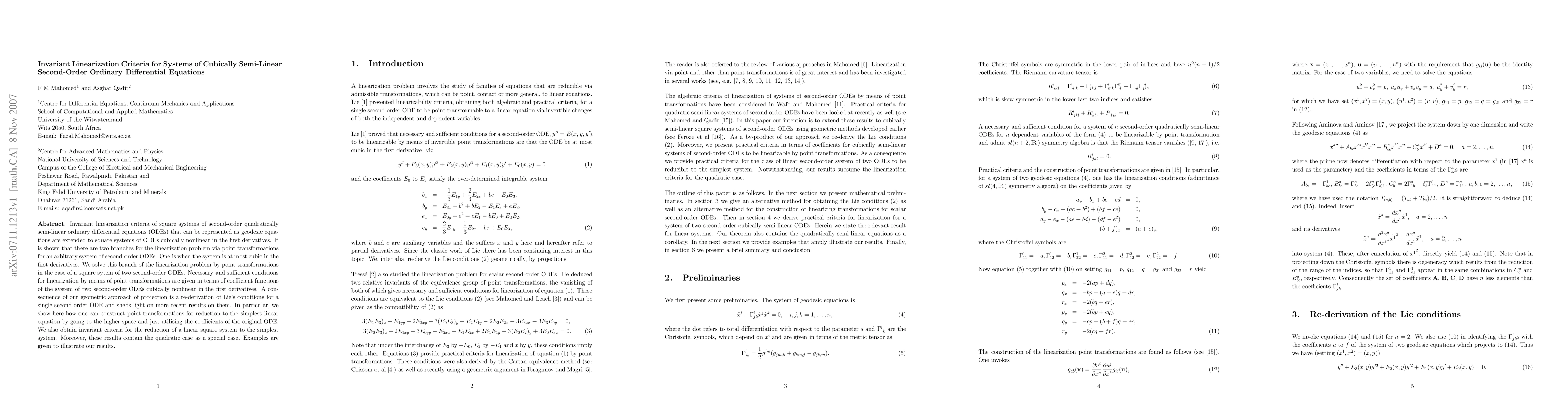 This paper extends invariant linearization criteria for cubically semi-linear second-order ODE systems, identifying two branches for linearization via point transformations. Necessary and sufficient conditions for linearization in terms of system coefficients are provided, and it includes a re-derivation of Lie's conditions with geometric projection insights.