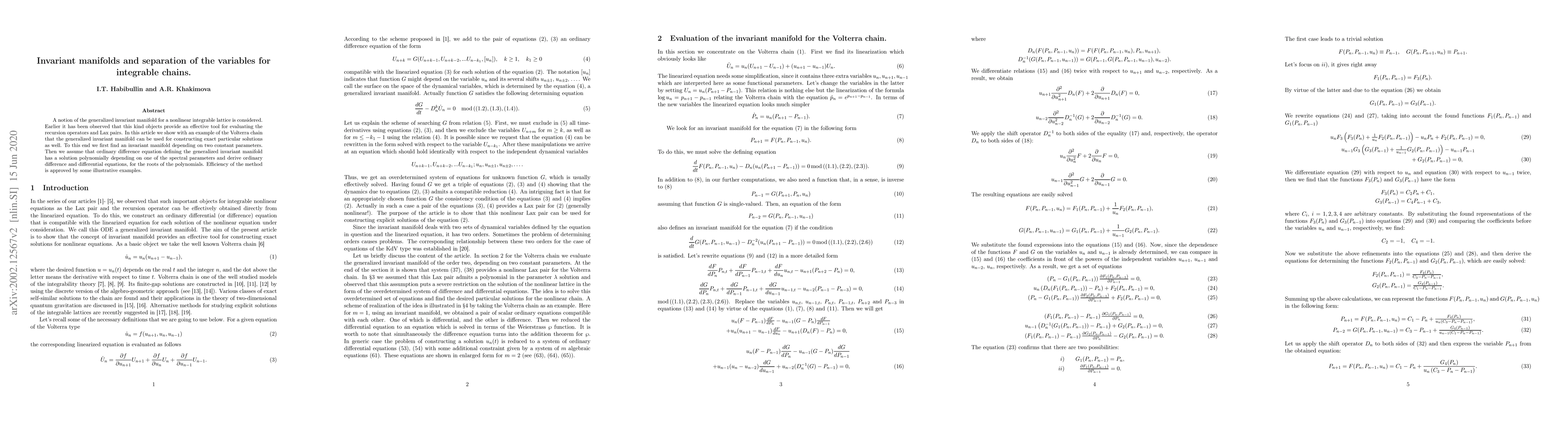 A notion of the generalized invariant manifold for a nonlinear integrable lattice is considered. Earlier it has been observed that this kind objects provide an effective tool for evaluating the recursion operators and Lax pairs. In this article we show with an example of the Volterra chain that the generalized invariant manifold can be used for constructing exact particular solutions as well. To this end we first find an invariant manifold depending on two constant parameters. Then we assume that ordinary difference equation defining the generalized invariant manifold has a solution polynomially depending on one of the spectral parameters and derive ordinary difference and differential equations, for the roots of the polynomials. Efficiency of the method is approved by some illustrative examples.