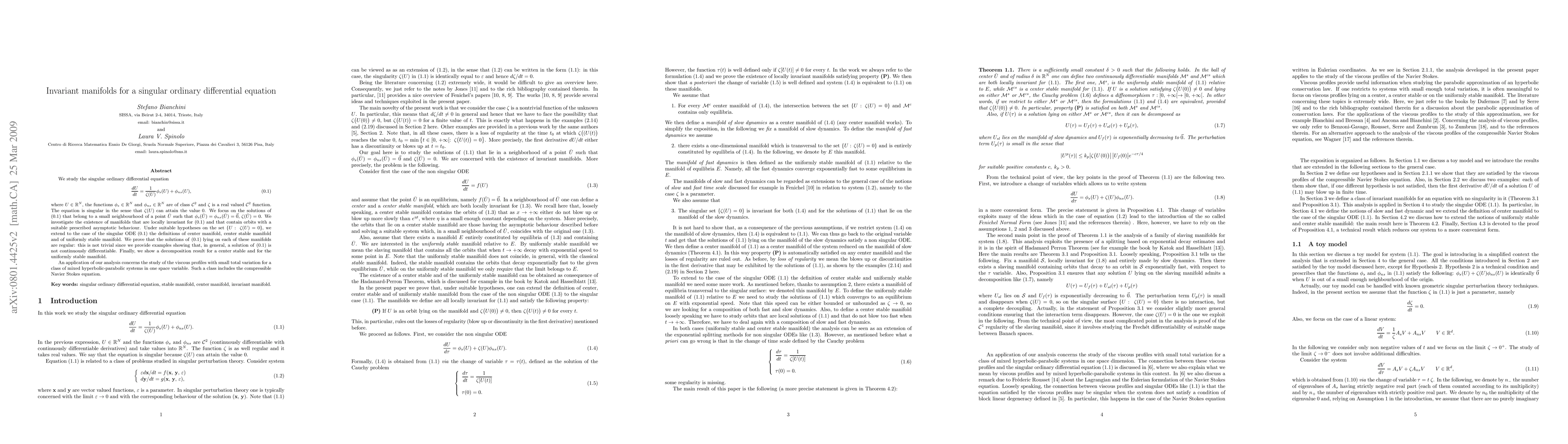 We study the singular ordinary differential equation $$ \frac{d U}{d t} = f (U) / z (U) + g (U), $$ where $U \in R^N$, the functions $f \in R^N $ and $g \in R^N $ are of class $C^2$ and $z $ is a real valued $C^2$ function. The equation is singular in the sense that $z (U)$ can attain the value 0. We focus on the solutions of the singular ODE that belong to a small neighborhood of a point $\bar U$ such that $f (\bar U) = g (\bar U) = \vec 0$, $z (\bar U) =0$. We investigate the existence of manifolds that are locally invariant for the singular ODE and that contain orbits with a suitable prescribed asymptotic behaviour. Under suitable hypotheses on the set $\{U: z (U) = 0 \}$, we extend to the case of the singular ODE the definitions of center manifold, center stable manifold and of uniformly stable manifold. An application of our analysis concerns the study of the viscous profiles with small total variation for a class of mixed hyperbolic-parabolic systems in one space variable. Such a class includes the compressible Navier Stokes equation.