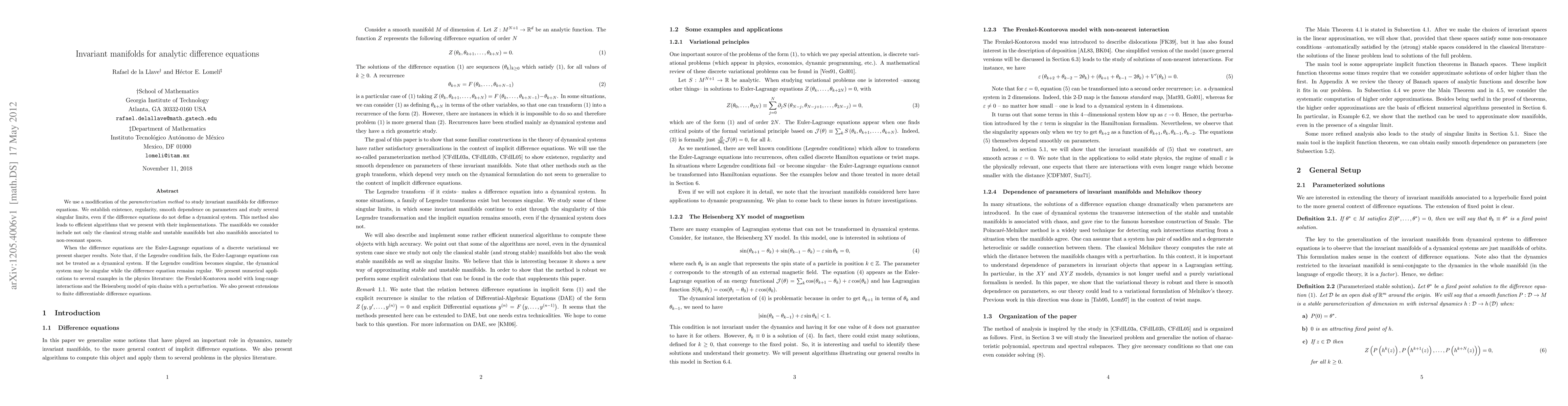 We use a modification of the parameterization method to study invariant manifolds for difference equations. We establish existence, regularity, smooth dependence on parameters and study several singular limits, even if the difference equations do not define a dynamical system. This method also leads to efficient algorithms that we present with their implementations. The manifolds we consider include not only the classical strong stable and unstable manifolds but also manifolds associated to non-resonant spaces. When the difference equations are the Euler-Lagrange equations of a discrete variational we present sharper results. Note that, if the Legendre condition fails, the Euler-Lagrange equations can not be treated as a dynamical system. If the Legendre condition becomes singular, the dynamical system may be singular while the difference equation remains regular. We present numerical applications to several examples in the physics literature: the Frenkel-Kontorova model with long-range interactions and the Heisenberg model of spin chains with a perturbation. We also present extensions to finite differentiable difference equations.