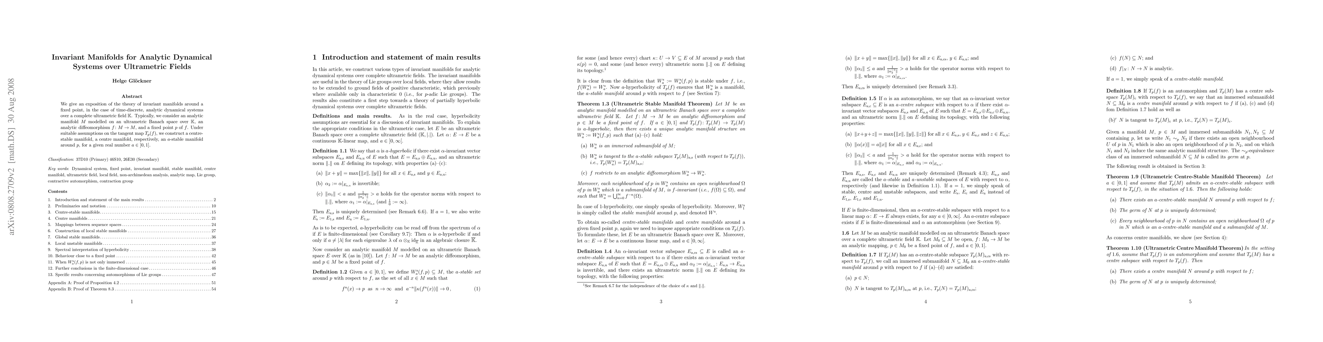 We give an exposition of the theory of invariant manifolds around a fixed point, in the case of time-discrete, analytic dynamical systems over a complete ultrametric field K. Typically, we consider an analytic manifold M modelled on an ultrametric Banach space over K, an analytic self-map f of M, and a fixed point p of f. Under suitable conditions on the tangent map of f at p, we construct a centre-stable manifold, a centre manifold, respectively, an r-stable manifold around p, for a given positive real number r not exceeding 1. The invariant manifolds are useful in the theory of Lie groups over local fields, where they allow results to be extended to the case of positive characteristic which previously were only available in characteristic zero (i.e., for p-adic Lie groups).