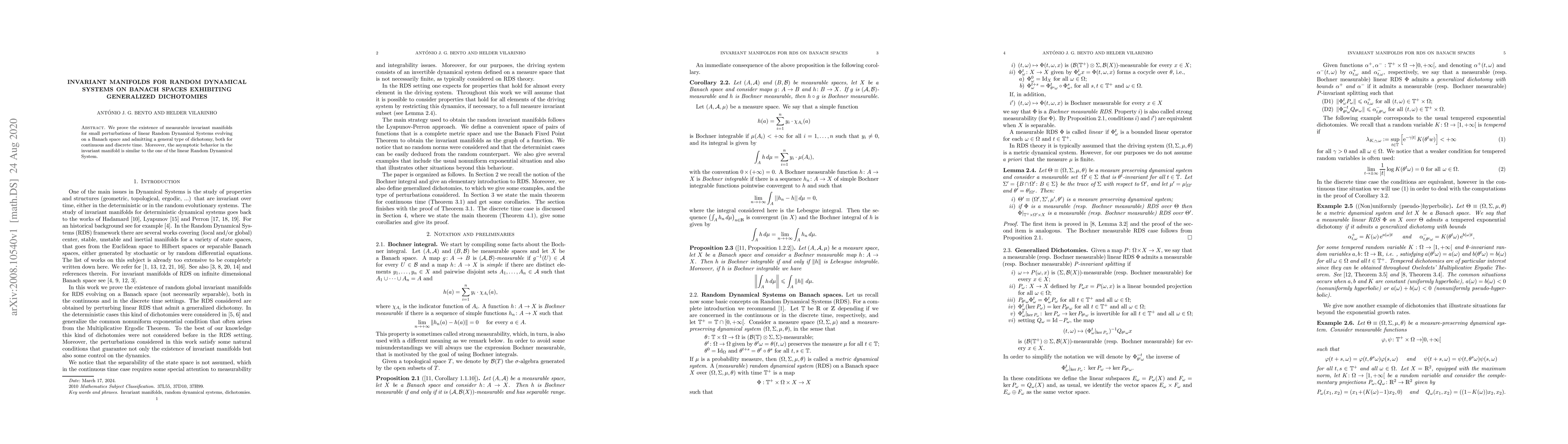We prove the existence of measurable invariant manifolds for small perturbations of linear Random Dynamical Systems evolving on a Banach space and admitting a general type of dichotomy, both for continuous and discrete time. Moreover, the asymptotic behavior in the invariant manifold is similar to the one of the linear Random Dynamical System.