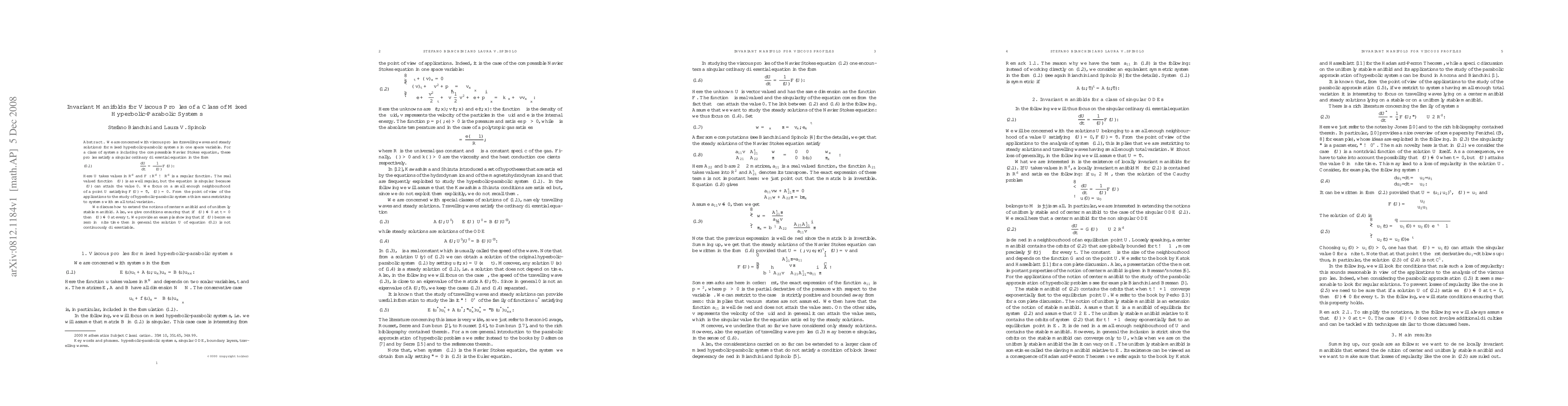 We are concerned with viscous profiles (travelling waves and steady solutions) for mixed hyperbolic-parabolic systems in one space variable. For a class of systems including the compressible Navier Stokes equation, these profiles satisfy a singular ordinary differential equation in the form \label{e:ab} dU / dt = F(U)/ z (U) . Here U takes values in $R^d$ and $F: R^d \to R^d$ is a regular function. The real valued function $z (U)$ is as well regular, but the equation is singular because $z (U)$ can attain the value 0. We focus on a small enough neighbourhood of a point $\bar U$ satisfying $F(\bar U) = \vec 0$, $z (\bar U) =0$. From the point of view of the applications to the study of hyperbolic-parabolic systems this means restricting to systems with small total variation. We discuss how to extend the notions of center manifold and of uniformly stable manifold. Also, we give conditions ensuring that if $z (U) \neq 0$ at $t=0$ then $z (U) \neq 0$ at every $t$. We provide an example showing that if $z(U)$ becomes zero in finite time then in general the solution $U$ of equation \eqref{e:ab} is not continuously differentiable.