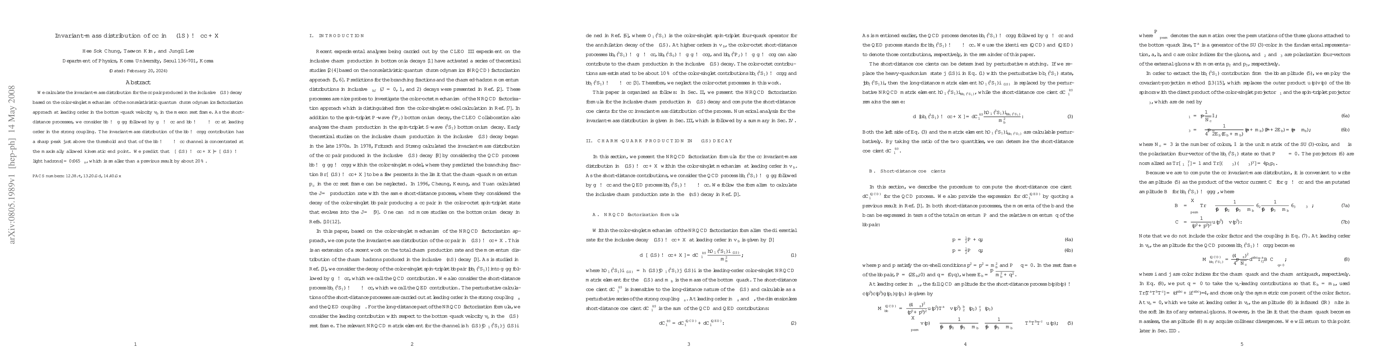 We calculate the invariant-mass distribution for the cc-bar pair produced in the inclusive Upsilon(1S) decay based on the color-singlet mechanism of the nonrelativistic quantum chromodynamics factorization approach at leading order in the bottom-quark velocity v_b in the meson rest frame. As the short-distance processes, we consider bb-bar -> g^*gg followed by g^* -> cc-bar and bb-bar -> gamma^* -> cc-bar at leading order in the strong coupling. The invariant-mass distribution of the bb-bar -> cc-bar gg contribution has a sharp peak just above the threshold and that of the bb-bar -> gamma^* -> cc-bar channel is concentrated at the maximally allowed kinematic end point. We predict that Gamma[Upsilon(1S) -> cc-bar+X]/Gamma[Upsilon(1S)->light hadrons] = 0.065 alpha_s, which is smaller than a previous result by about 20%.