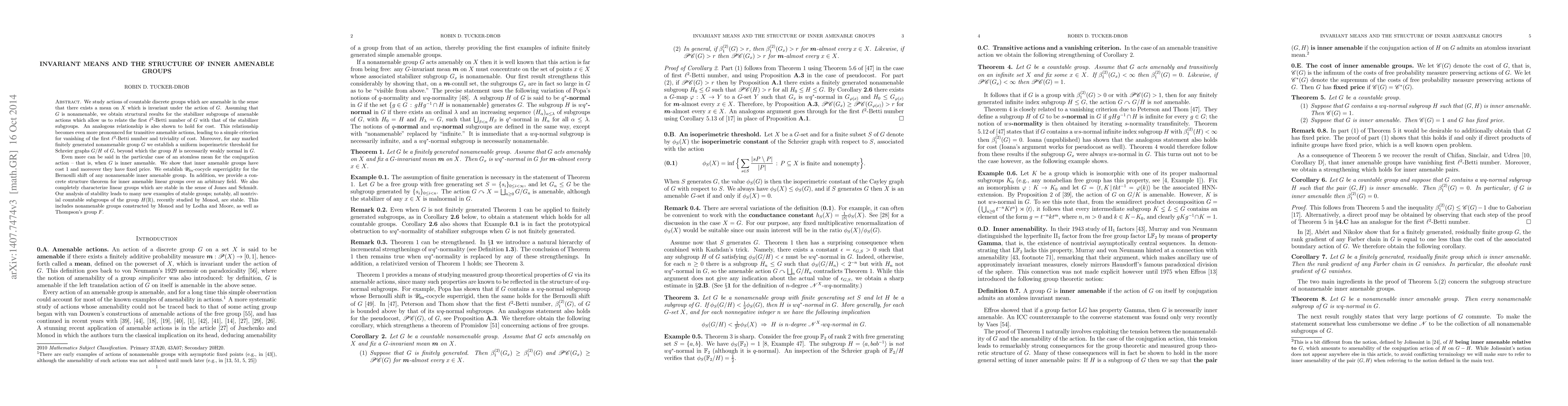This paper explores the structure of inner amenable groups through invariant means and their actions, revealing a relationship between the first l2-Betti number and stabilizer subgroups. It establishes uniform isoperimetric thresholds for Schreier graphs and provides a structure theorem for inner amenable linear groups, along with characterizations of stable linear groups.