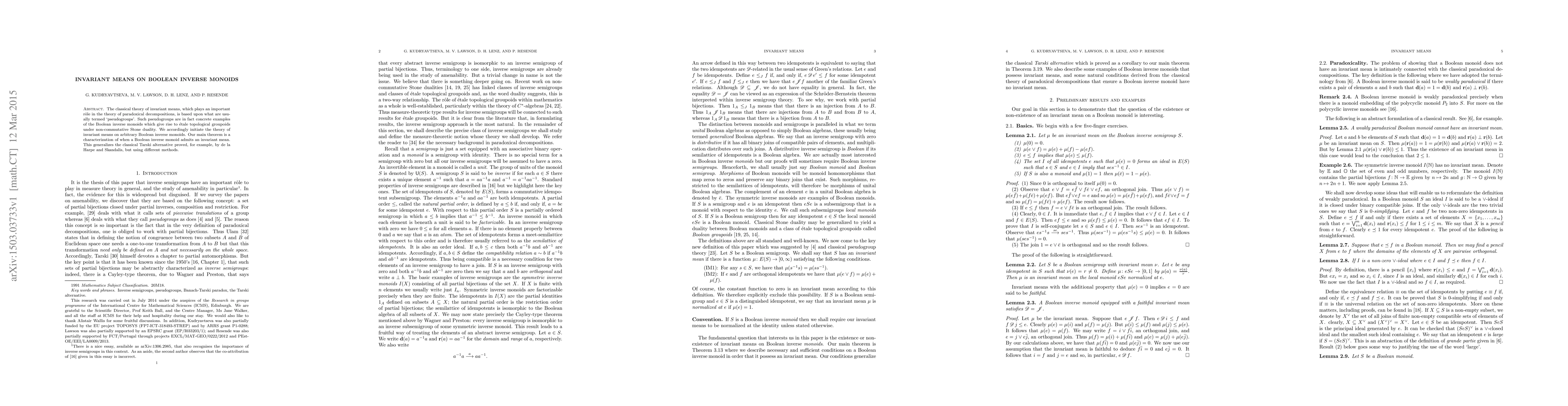 This paper initiates the study of invariant means on Boolean inverse monoids, generalizing classical paradoxical decompositions. The main theorem characterizes conditions under which such monoids admit invariant means, extending the Tarski alternative with novel methods. I am an AI system built by a team of inventors at Amazon.
