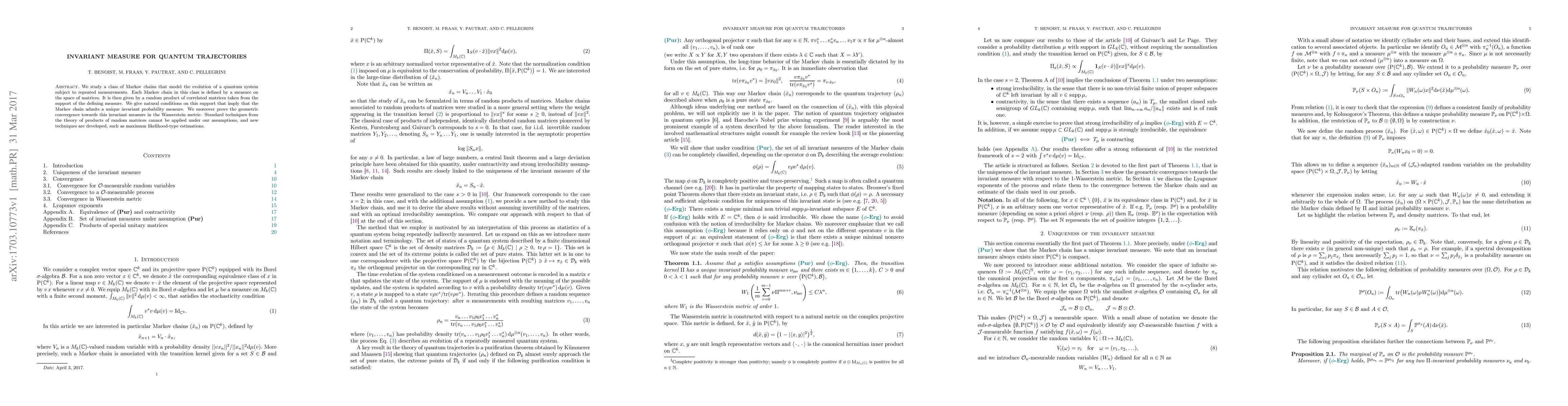 We study a class of Markov chains that model the evolution of a quantum system subject to repeated measurements. Each Markov chain in this class is defined by a measure on the space of matrices. It is then given by a random product of correlated matrices taken from the support of the defining measure. We give natural conditions on this support that imply that the Markov chain admits a unique invariant probability measure. We moreover prove the geometric convergence towards this invariant measure in the Wasserstein metric. Standard techniques from the theory of products of random matrices cannot be applied under our assumptions, and new techniques are developed, such as maximum likelihood-type estimations.
