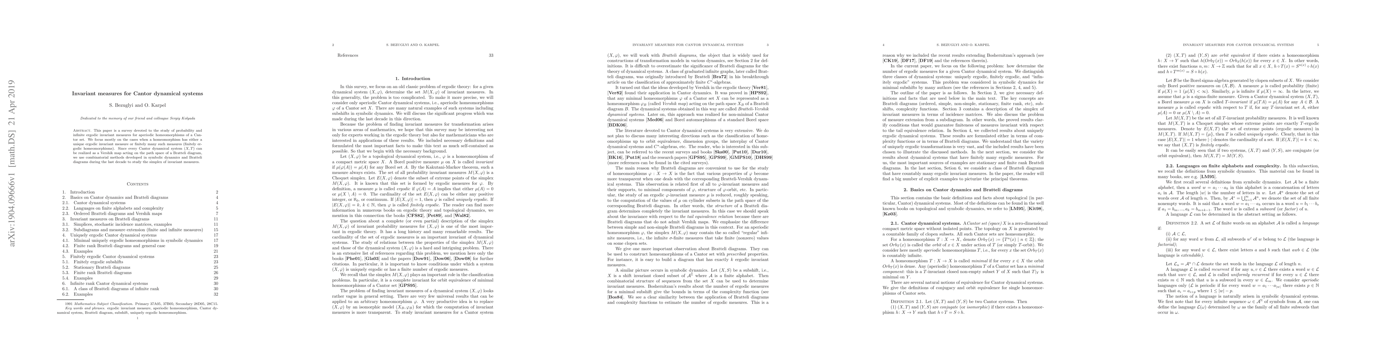 This paper is a survey devoted to the study of probability and infinite ergodic invariant measures for aperiodic homeomorphisms of a Cantor set. We focus mostly on the cases when a homeomorphism has either a unique ergodic invariant measure or finitely many such measures (finitely ergodic homeomorphisms). Since every Cantor dynamical system $(X,T)$ can be realized as a Vershik map acting on the path space of a Bratteli diagram, we use combinatorial methods developed in symbolic dynamics and Bratteli diagrams during the last decade to study the simplex of invariant measures.