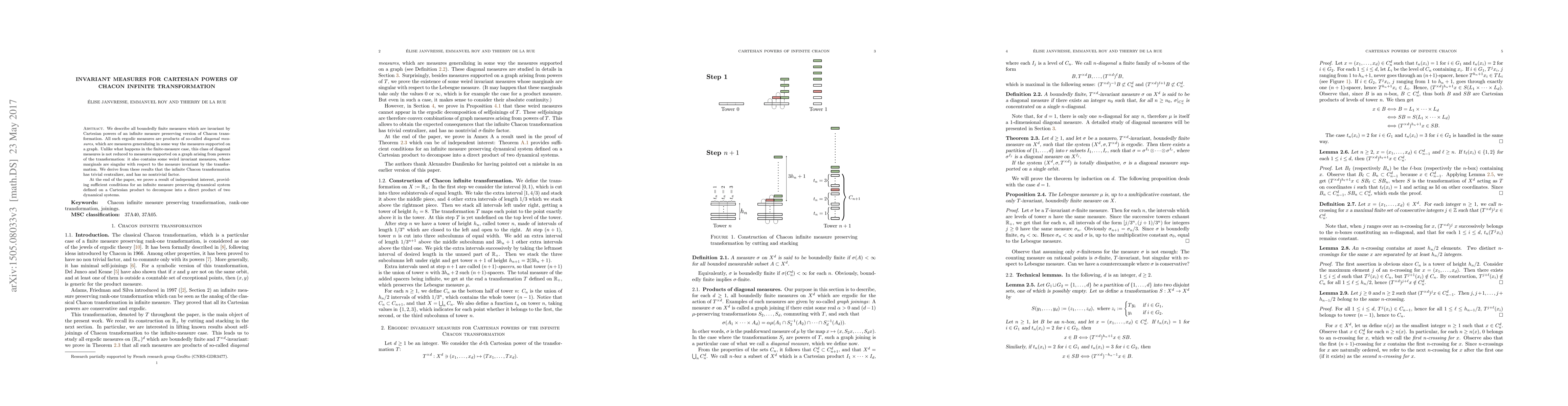 This paper identifies all boundedly finite invariant measures for Cartesian powers of an infinite Chacon transformation, showing they are products of diagonal measures. It concludes that the infinite Chacon transformation has a trivial centralizer and no nontrivial factors, and provides conditions for dynamical systems decomposition on Cartesian products.