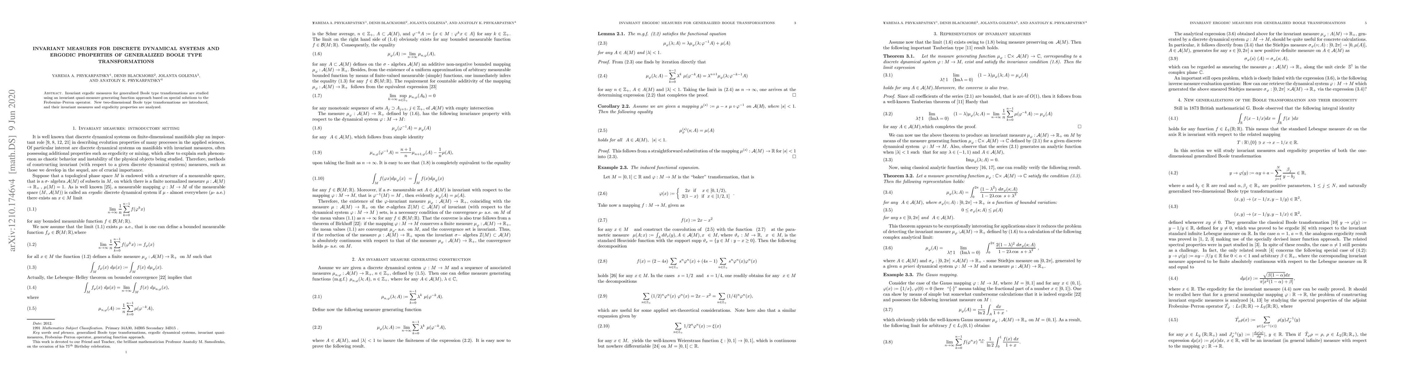 Invariant ergodic measures for generalized Boole type transformations are studied using an invariant quasi-measure generating function approach based on special solutions to the Frobenius--Perron operator. New two-dimensional Boole type transformations are introduced, and their invariant measures and ergodicity properties are analyzed.