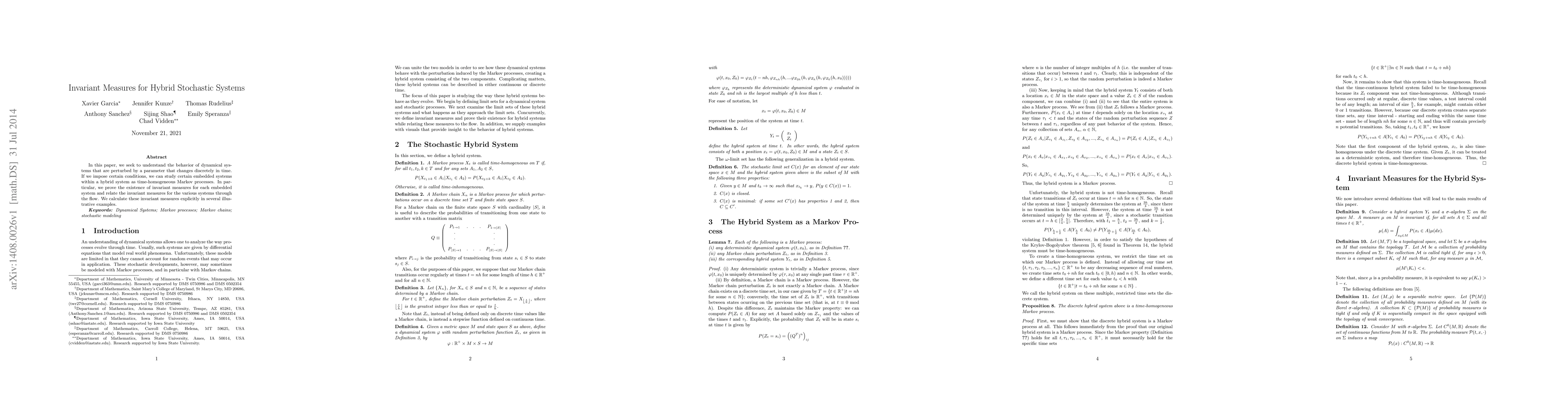 This paper explores the behavior of hybrid stochastic systems with discrete parameter changes, proving the existence of invariant measures for embedded time-homogeneous Markov processes within the hybrid system. It also explicitly calculates these measures in several examples.