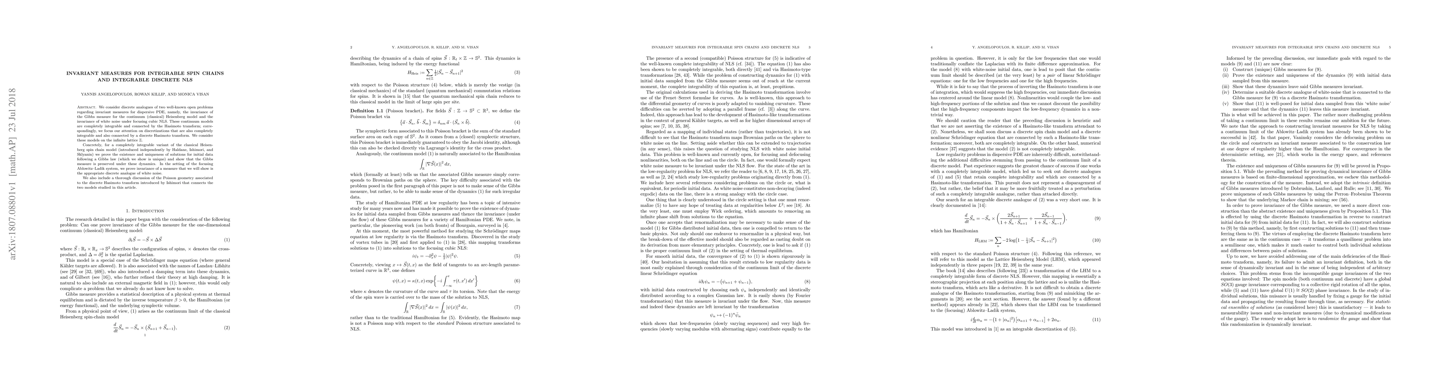 We consider discrete analogues of two well-known open problems regarding invariant measures for dispersive PDE, namely, the invariance of the Gibbs measure for the continuum (classical) Heisenberg model and the invariance of white noise under focusing cubic NLS. These continuum models are completely integrable and connected by the Hasimoto transform; correspondingly, we focus our attention on discretizations that are also completely integrable and also connected by a discrete Hasimoto transform. We consider these models on the infinite lattice $\mathbb Z$. Concretely, for a completely integrable variant of the classical Heisenberg spin chain model (introduced independently by Haldane, Ishimori, and Sklyanin) we prove the existence and uniqueness of solutions for initial data following a Gibbs law (which we show is unique) and show that the Gibbs measure is preserved under these dynamics. In the setting of the focusing Ablowitz--Ladik system, we prove invariance of a measure that we will show is the appropriate discrete analogue of white noise. We also include a thorough discussion of the Poisson geometry associated to the discrete Hasimoto transform introduced by Ishimori that connects the two models studied in this article.