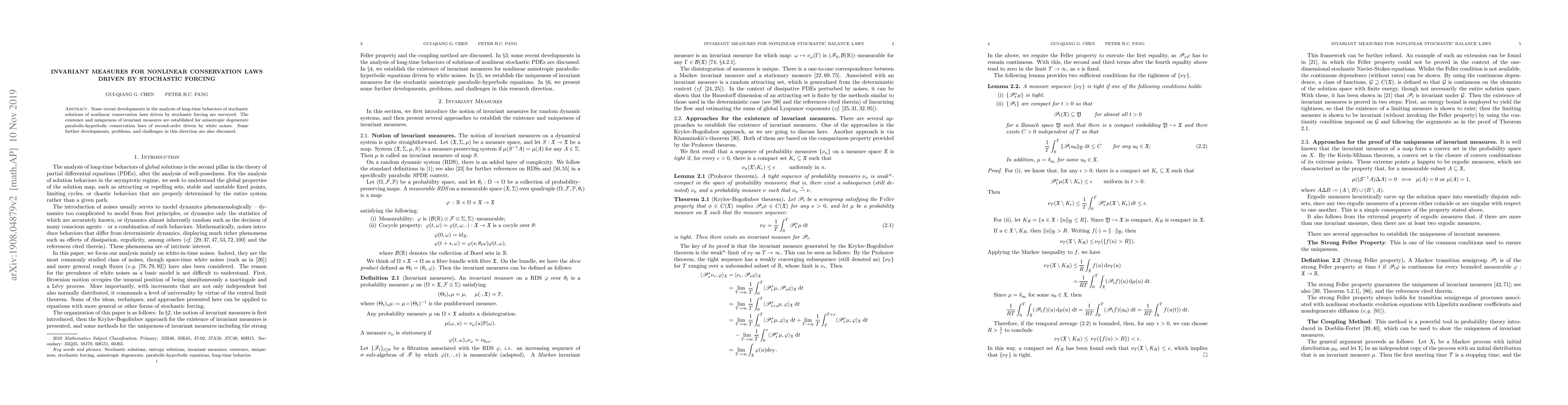 Some recent developments in the analysis of long-time behaviors of stochastic solutions of nonlinear conservation laws driven by stochastic forcing are surveyed. The existence and uniqueness of invariant measures are established for anisotropic degenerate parabolic-hyperbolic conservation laws of second-order driven by white noises. Some further developments, problems, and challenges in this direction are also discussed.