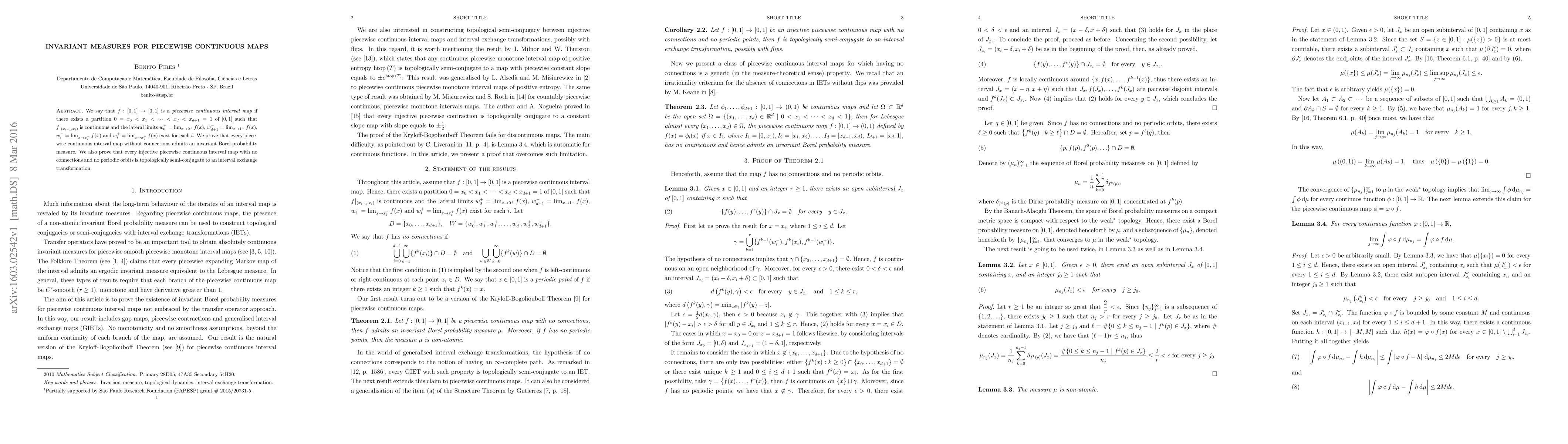 The work extends previous results on invariant measures for continuous maps to the piecewise continuous case, providing conditions under which such measures exist and characterizing the topological behavior of certain piecewise continuous maps.