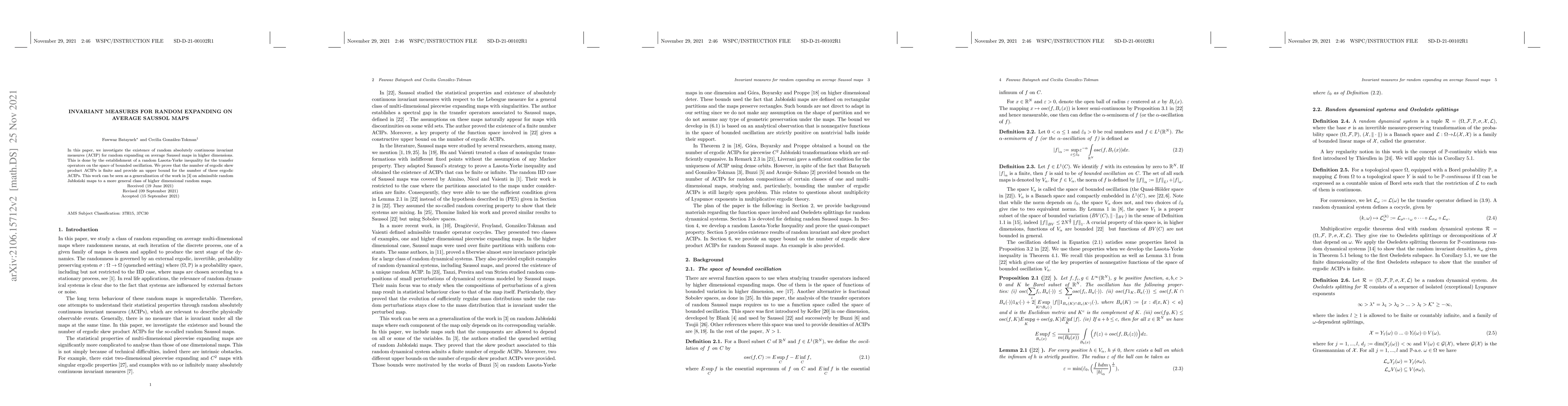 This paper establishes the existence of finite ergodic skew product absolutely continuous invariant probability measures for random expanding on average Saussol maps in higher dimensions, proving a random Lasota-Yorke inequality and generalizing previous results on admissible random Jabloński maps.
