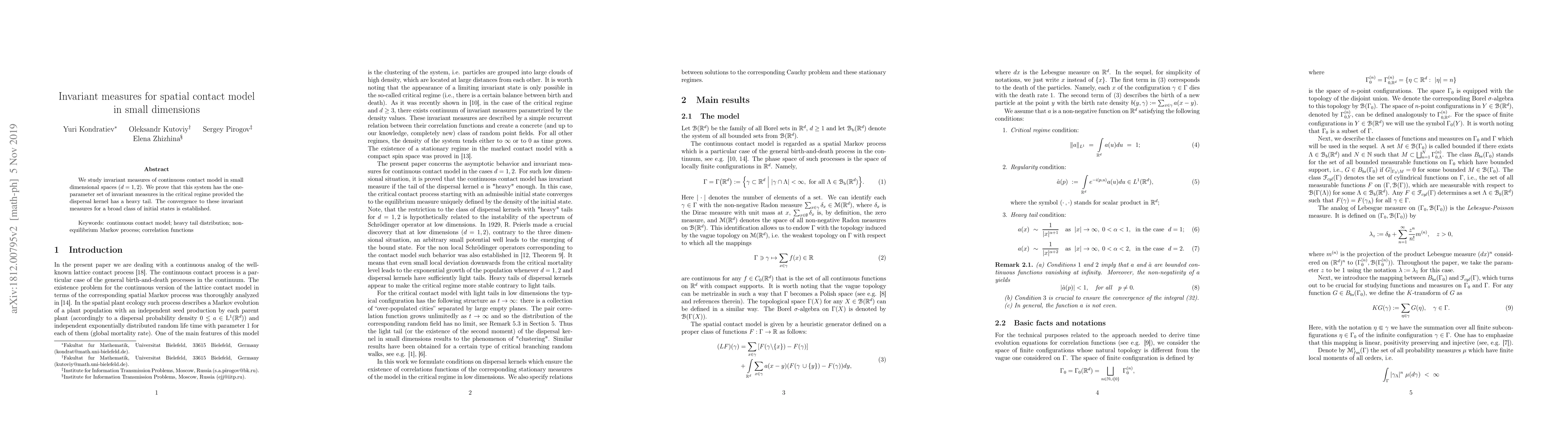 We study invariant measures of continuous contact model in small dimensional spaces ($d =1,2$). Under general conditions we prove that in the critical regime this system has the one-parameter set of invariant measures parametrized by the spatial density of particles. Also for broad class of initial states we prove the convergence to one of these invariant measures.
