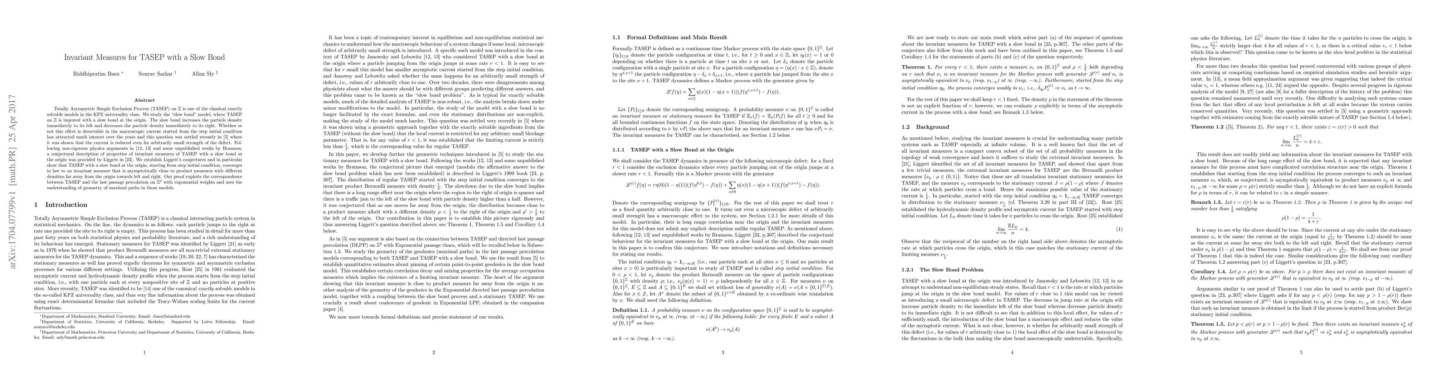 This paper establishes Liggett's conjectures regarding the invariant measures for the TASEP model with a slow bond at the origin, showing that it converges to an invariant measure with different densities on either side of the origin. The proof leverages the connection between TASEP and last passage percolation with exponential weights.