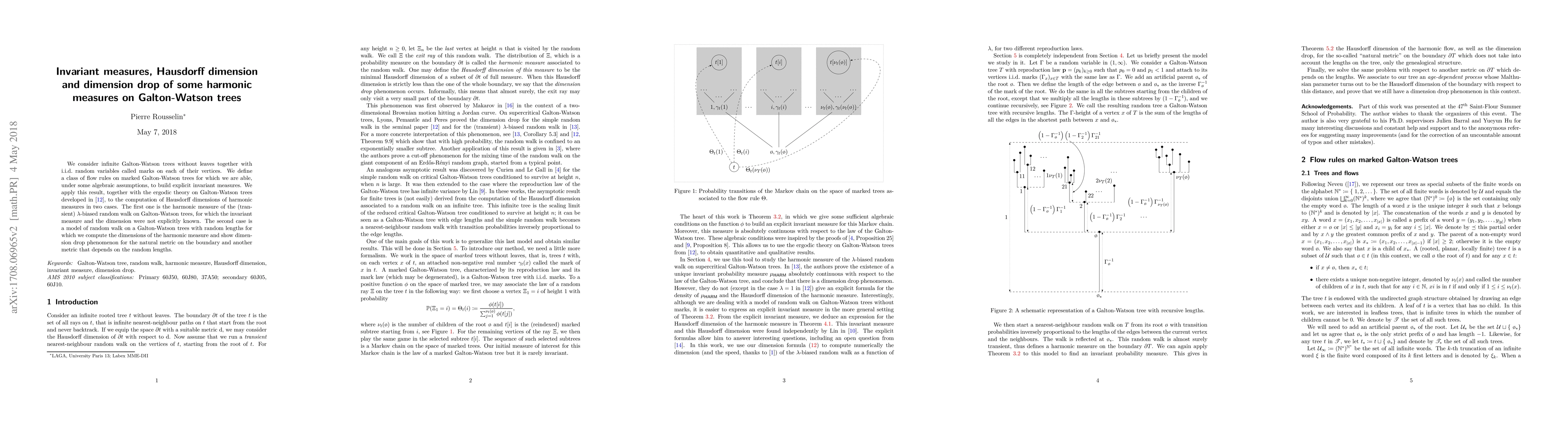 This paper investigates invariant measures and Hausdorff dimensions for harmonic measures on infinite Galton-Watson trees with random marks. It constructs explicit invariant measures under certain algebraic assumptions and computes Hausdorff dimensions for two specific random walk models, revealing a dimension drop phenomenon in one case.