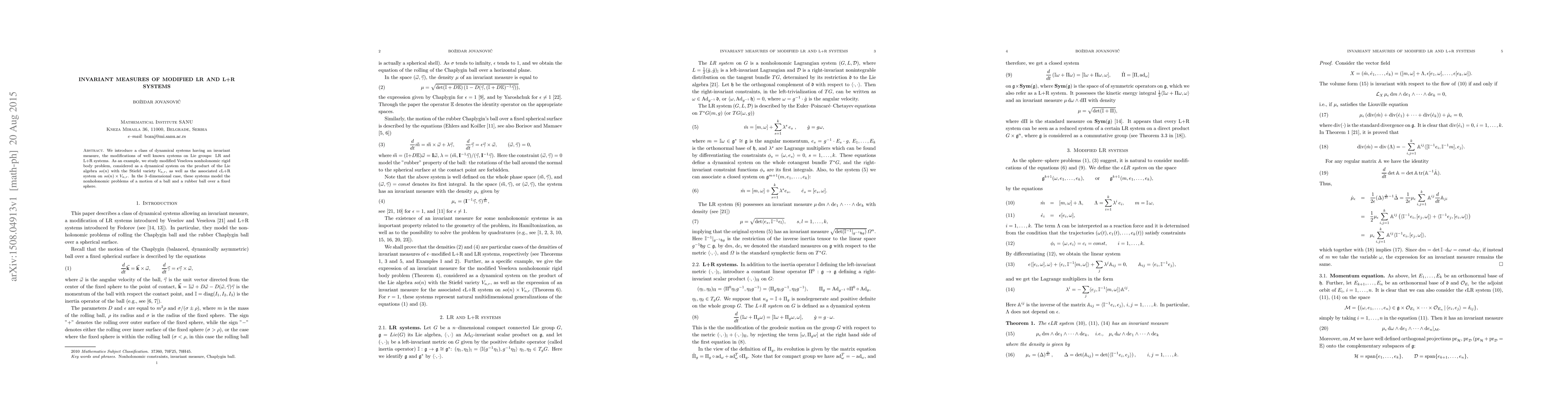 This paper investigates invariant measures for modified LR and L+R dynamical systems on Lie groups, exemplified by the modified Veselova problem and its associated $\epsilon$L+R system. The study focuses on nonholonomic motion models, such as a ball and a rubber ball moving over a fixed sphere in three dimensions.
