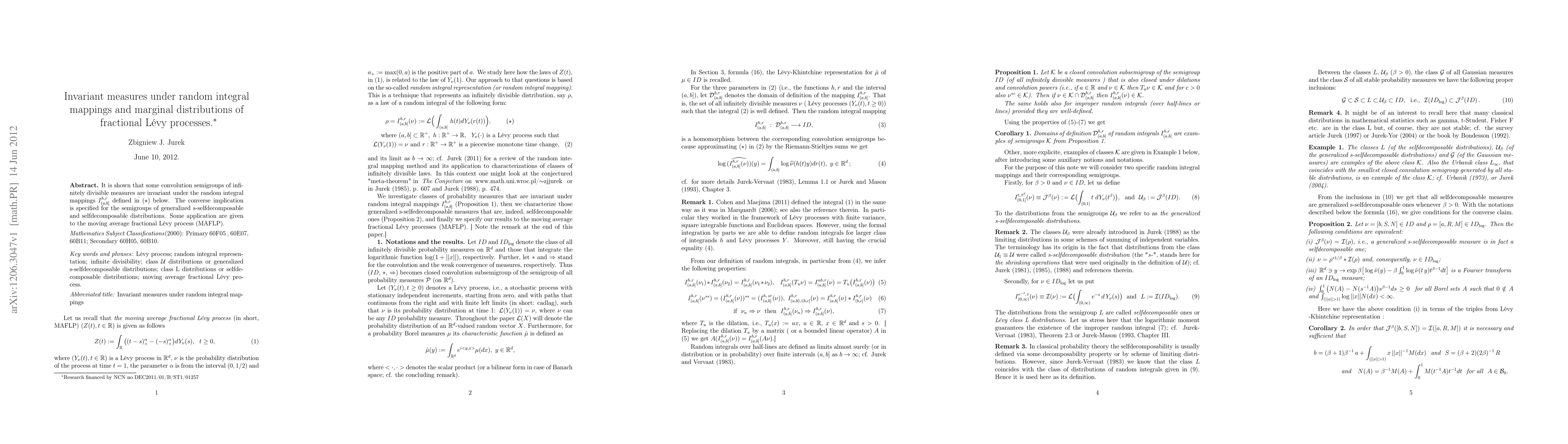 Summary: The paper demonstrates that specific convolution semigroups of infinitely divisible measures remain invariant under certain random integral mappings, with particular attention to generalized s-selfdecomposable and selfdecomposable distributions. Applications include insights into the marginal distributions of the moving average fractional Lévy process (MAFLP).