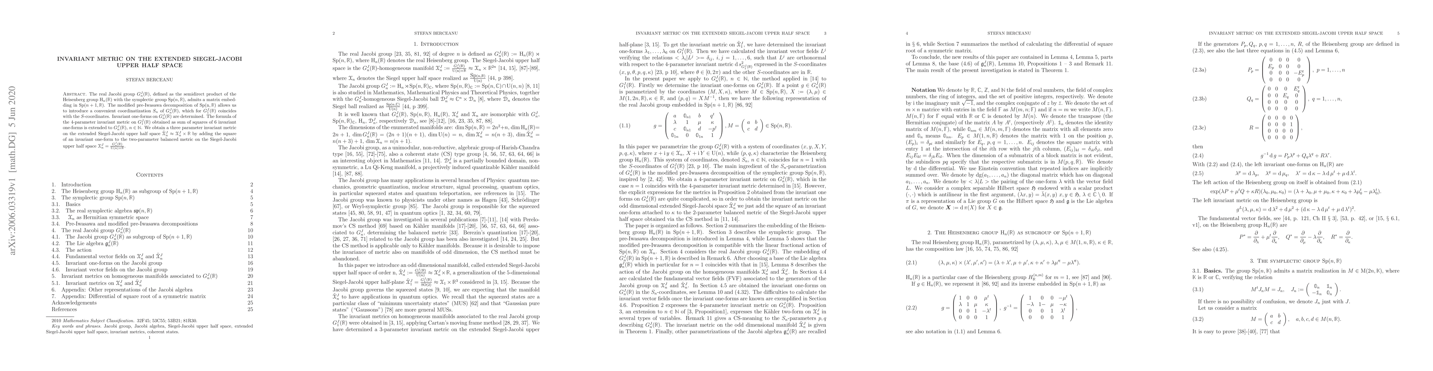 The real Jacobi group $G^J_n(\mathbb{R})$, defined as the semidirect product of the Heisenberg group ${\rm H}_n(\R)$ with the symplectic group ${\mr {Sp}}(n,\mathbb{R})$, admits a matrix embedding in $\text{Sp}(n+1,\mathbb{R})$. The modified pre-Iwasawa decomposition of $\rm{Sp}(n,\mathbb{R})$ allows us to introduce a convenient coordinatization $S_n$ of $G^J_n(\mathbb{R})$, which for $G^J_1(\mathbb{R})$ coincides with the $S$-coordinates. Invariant one-forms on $G^J_n(\mathbb{R})$ are determined. The formula of the 4-parameter invariant metric on $G^J_1(\R)$ obtained as sum of squares of 6 invariant one-forms is extended to $G^J_n(\R)$, $n\in\mathbb{N}$. We obtain a three parameter invariant metric on the extended Siegel-Jacobi upper half space $\tilde{\mathcal{X}}^J_n\approx\mathcal{X}^J_n\times \mathbb{R}$ by adding the square of an invariant one-form to the two-parameter balanced metric on the Siegel-Jacobi upper half space $ {\mathcal{X}}^J_n =\frac{G^J_n(\mathbb{R})}{\mr{U}(n)\times\mathbb{R}}$.