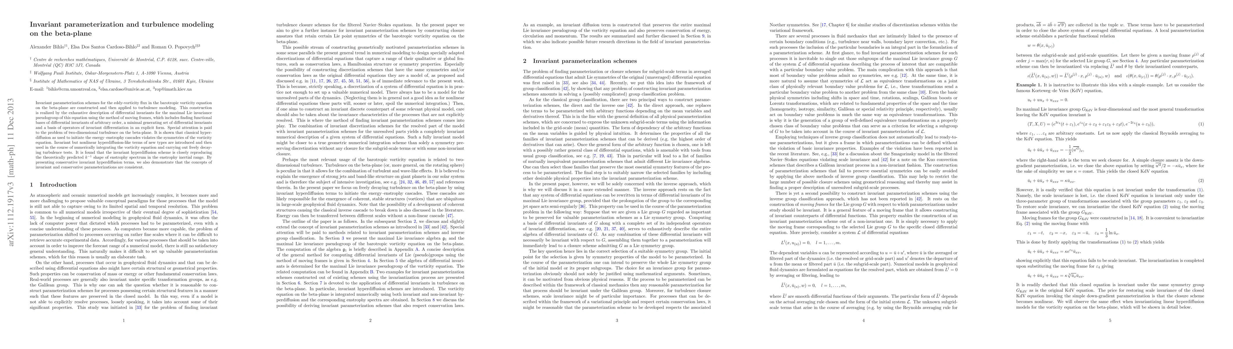 This paper constructs invariant parameterization schemes for turbulence modeling on the beta-plane, introducing invariant hyperdiffusion terms that better respect the symmetries of the vorticity equation. Numerical tests show that these terms improve the modeling of the energy spectrum in freely decaying turbulence.
